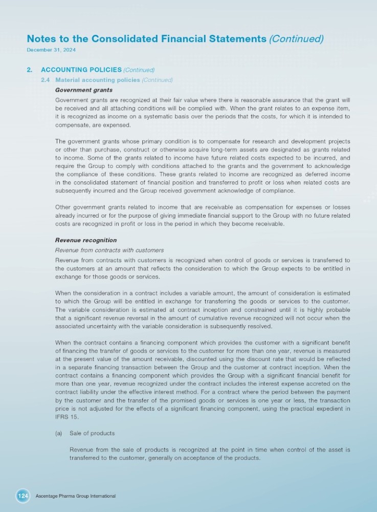 Ascentage Pharma Group International 124 Notes to the Consolidated Financial Statements (Continued) December 31, 2024 2. ACCOUNTING POLICIES (Continued) 4. Material accounting policies (Continued) Government grants Government grants are recognized at their fair value where there is reasonable assurance that the grant will be received and all attaching conditions will be complied with . When the grant relates to an expense item, it is recognized as income on a systematic basis over the periods that the costs, for which it is intended to compensate, are expensed . The government grants whose primary condition is to compensate for research and development projects or other than purchase, construct or otherwise acquire long - term assets are designated as grants related to income . Some of the grants related to income have future related costs expected to be incurred, and require the Group to comply with conditions attached to the grants and the government to acknowledge the compliance of these conditions . These grants related to income are recognized as deferred income in the consolidated statement of financial position and transferred to profit or loss when related costs are subsequently incurred and the Group received government acknowledge of compliance . Other government grants related to income that are receivable as compensation for expenses or losses already incurred or for the purpose of giving immediate financial support to the Group with no future related costs are recognized in profit or loss in the period in which they become receivable . Revenue recognition Revenue from contracts with customers Revenue from contracts with customers is recognized when control of goods or services is transferred to the customers at an amount that reflects the consideration to which the Group expects to be entitled in exchange for those goods or services . When the consideration in a contract includes a variable amount, the amount of consideration is estimated to which the Group will be entitled in exchange for transferring the goods or services to the customer . The variable consideration is estimated at contract inception and constrained until it is highly probable that a significant revenue reversal in the amount of cumulative revenue recognized will not occur when the associated uncertainty with the variable consideration is subsequently resolved . When the contract contains a financing component which provides the customer with a significant benefit of financing the transfer of goods or services to the customer for more than one year, revenue is measured at the present value of the amount receivable, discounted using the discount rate that would be reflected in a separate financing transaction between the Group and the customer at contract inception . When the contract contains a financing component which provides the Group with a significant financial benefit for more than one year, revenue recognized under the contract includes the interest expense accreted on the contract liability under the effective interest method . For a contract where the period between the payment by the customer and the transfer of the promised goods or services is one year or less, the transaction price is not adjusted for the effects of a significant financing component, using the practical expedient in IFRS 15 . (a) Sale of products Revenue from the sale of products is recognized at the point in time when control of the asset is transferred to the customer, generally on acceptance of the products.