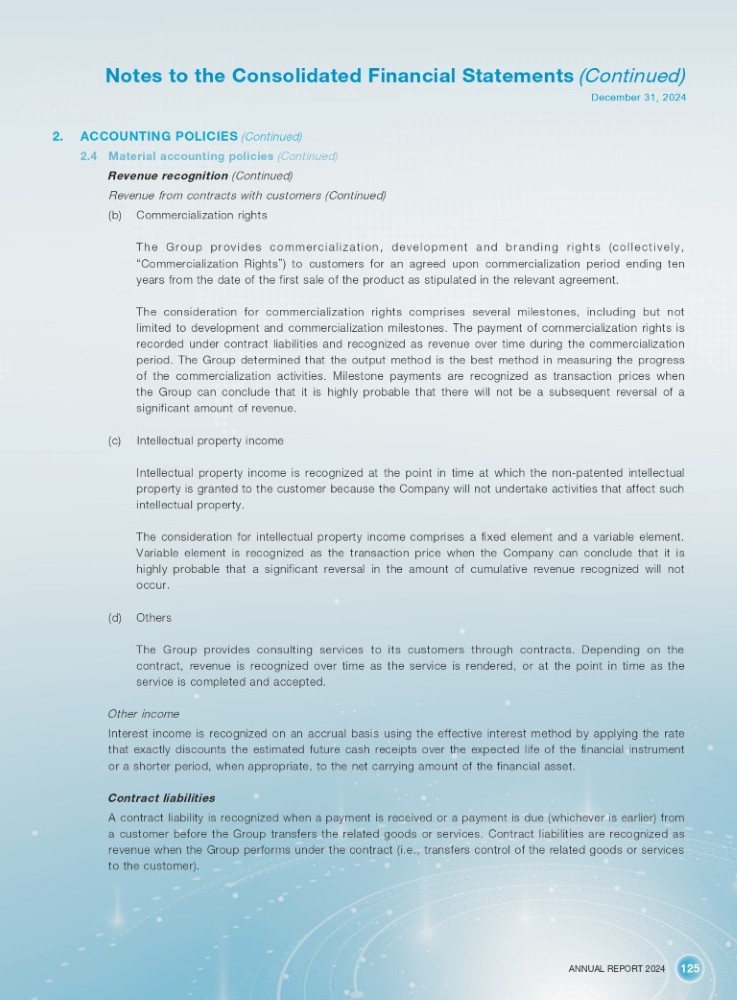 ANNUAL REPORT 2024 125 Notes to the Consolidated Financial Statements (Continued) December 31, 2024 2. ACCOUNTING POLICIES (Continued) 4. Material accounting policies (Continued) Revenue recognition (Continued) Revenue from contracts with customers (Continued) (b) Commercialization rights Th e G rou p prov ide s comm erc ial iza tio n, dev el opment and b r andi ng ri ghts (c oll ec tiv ely , “ Commercialization Rights ” ) to customers for an agreed upon commercialization period ending ten years from the date of the first sale of the product as stipulated in the relevant agreement . The consideration for commercialization rights comprises several milestones, including but not limited to development and commercialization milestones . The payment of commercialization rights is recorded under contract liabilities and recognized as revenue over time during the commercialization period . The Group determined that the output method is the best method in measuring the progress of the commercialization activities . Milestone payments are recognized as transaction prices when the Group can conclude that it is highly probable that there will not be a subsequent reversal of a significant amount of revenue . (c) Intellectual property income Intellectual property income is recognized at the point in time at which the non - patented intellectual property is granted to the customer because the Company will not undertake activities that affect such intellectual property . The consideration for intellectual property income comprises a fixed element and a variable element . Variable element is recognized as the transaction price when the Company can conclude that it is highly probable that a significant reversal in the amount of cumulative revenue recognized will not occur . (d) Others The Group provides consulting services to its customers through contracts . Depending on the contract, revenue is recognized over time as the service is rendered, or at the point in time as the service is completed and accepted . Other income Interest income is recognized on an accrual basis using the effective interest method by applying the rate that exactly discounts the estimated future cash receipts over the expected life of the financial instrument or a shorter period, when appropriate, to the net carrying amount of the financial asset . Contract liabilities A contract liability is recognized when a payment is received or a payment is due (whichever is earlier) from a customer before the Group transfers the related goods or services . Contract liabilities are recognized as revenue when the Group performs under the contract (i . e . , transfers control of the related goods or services to the customer) .