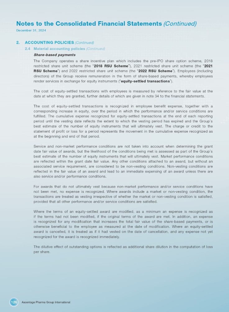 Ascentage Pharma Group International 126 Notes to the Consolidated Financial Statements (Continued) December 31, 2024 2. ACCOUNTING POLICIES (Continued) 2.4 Material accounting policies (Continued) Share - based payments The Company operates a share incentive plan which includes the pre - IPO share option scheme, 2018 restricted share unit scheme (the “ 2018 RSU Scheme ” ), 2021 restricted share unit scheme (the “ 2021 RSU Scheme ” ) and 2022 restricted share unit scheme (the “ 2022 RSU Scheme ” ) . Employees (including directors) of the Group receive remuneration in the form of share - based payments, whereby employees render services in exchange for equity instruments ( “ equity - settled transactions ” ) . The cost of equity - settled transactions with employees is measured by reference to the fair value at the date at which they are granted, further details of which are given in note 34 to the financial statements . The cost of equity - settled transactions is recognized in employee benefit expense, together with a corresponding increase in equity, over the period in which the performance and/or service conditions are fulfilled . The cumulative expense recognized for equity - settled transactions at the end of each reporting period until the vesting date reflects the extent to which the vesting period has expired and the Group ’ s best estimate of the number of equity instruments that will ultimately vest . The charge or credit to the statement of profit or loss for a period represents the movement in the cumulative expense recognized as at the beginning and end of that period . Service and non - market performance conditions are not taken into account when determining the grant date fair value of awards, but the likelihood of the conditions being met is assessed as part of the Group ’ s best estimate of the number of equity instruments that will ultimately vest . Market performance conditions are reflected within the grant date fair value . Any other conditions attached to an award, but without an associated service requirement, are considered to be non - vesting conditions . Non - vesting conditions are reflected in the fair value of an award and lead to an immediate expensing of an award unless there are also service and/or performance conditions . For awards that do not ultimately vest because non - market performance and/or service conditions have not been met, no expense is recognized . Where awards include a market or non - vesting condition, the transactions are treated as vesting irrespective of whether the market or non - vesting condition is satisfied, provided that all other performance and/or service conditions are satisfied . Where the terms of an equity - settled award are modified, as a minimum an expense is recognized as if the terms had not been modified, if the original terms of the award are met . In addition, an expense is recognized for any modification that increases the total fair value of the share - based payments, or is otherwise beneficial to the employee as measured at the date of modification . Where an equity - settled award is cancelled, it is treated as if it had vested on the date of cancellation, and any expense not yet recognized for the award is recognized immediately . The dilutive effect of outstanding options is reflected as additional share dilution in the computation of loss per share .