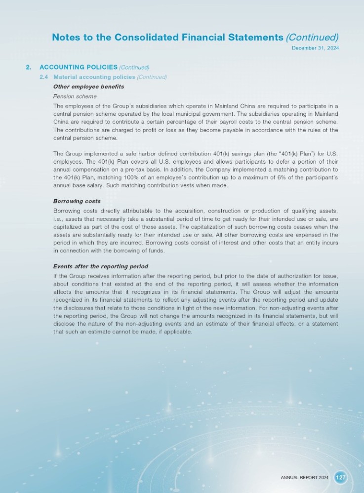 ANNUAL REPORT 2024 127 Notes to the Consolidated Financial Statements (Continued) December 31, 2024 2. ACCOUNTING POLICIES (Continued) 2.4 Material accounting policies (Continued) Other employee benefits Pension scheme The employees of the Group ’ s subsidiaries which operate in Mainland China are required to participate in a central pension scheme operated by the local municipal government . The subsidiaries operating in Mainland China are required to contribute a certain percentage of their payroll costs to the central pension scheme . The contributions are charged to profit or loss as they become payable in accordance with the rules of the central pension scheme . The Group implemented a safe harbor defined contribution 401 (k) savings plan (the “ 401 (k) Plan ” ) for U . S . employees . The 401 (k) Plan covers all U . S . employees and allows participants to defer a portion of their annual compensation on a pre - tax basis . In addition, the Company implemented a matching contribution to the 401 (k) Plan, matching 100 % of an employee ’ s contribution up to a maximum of 6 % of the participant ’ s annual base salary . Such matching contribution vests when made . Borrowing costs Borrowing costs directly attributable to the acquisition, construction or production of qualifying assets, i . e . , assets that necessarily take a substantial period of time to get ready for their intended use or sale, are capitalized as part of the cost of those assets . The capitalization of such borrowing costs ceases when the assets are substantially ready for their intended use or sale . All other borrowing costs are expensed in the period in which they are incurred . Borrowing costs consist of interest and other costs that an entity incurs in connection with the borrowing of funds . Events after the reporting period If the Group receives information after the reporting period, but prior to the date of authorization for issue, about conditions that existed at the end of the reporting period, it will assess whether the information affects the amounts that it recognizes in its financial statements . The Group will adjust the amounts recognized in its financial statements to reflect any adjusting events after the reporting period and update the disclosures that relate to those conditions in light of the new information . For non - adjusting events after the reporting period, the Group will not change the amounts recognized in its financial statements, but will disclose the nature of the non - adjusting events and an estimate of their financial effects, or a statement that such an estimate cannot be made, if applicable .