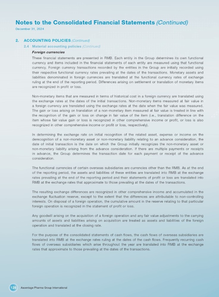 Ascentage Pharma Group International 128 Notes to the Consolidated Financial Statements (Continued) December 31, 2024 2. ACCOUNTING POLICIES (Continued) 2.4 Material accounting policies (Continued) Foreign currencies These financial statements are presented in RMB . Each entity in the Group determines its own functional currency and items included in the financial statements of each entity are measured using that functional currency . Foreign currency transactions recorded by the entities in the Group are initially recorded using their respective functional currency rates prevailing at the dates of the transactions . Monetary assets and liabilities denominated in foreign currencies are translated at the functional currency rates of exchange ruling at the end of the reporting period . Differences arising on settlement or translation of monetary items are recognized in profit or loss . Non - monetary items that are measured in terms of historical cost in a foreign currency are translated using the exchange rates at the dates of the initial transactions . Non - monetary items measured at fair value in a foreign currency are translated using the exchange rates at the date when the fair value was measured . The gain or loss arising on translation of a non - monetary item measured at fair value is treated in line with the recognition of the gain or loss on change in fair value of the item (i . e . , translation difference on the item whose fair value gain or loss is recognized in other comprehensive income or profit, or loss is also recognized in other comprehensive income or profit or loss, respectively) . In determining the exchange rate on initial recognition of the related asset, expense or income on the derecognition of a non - monetary asset or non - monetary liability relating to an advance consideration, the date of initial transaction is the date on which the Group initially recognizes the non - monetary asset or non - monetary liability arising from the advance consideration . If there are multiple payments or receipts in advance, the Group determines the transaction date for each payment or receipt of the advance consideration . The functional currencies of certain overseas subsidiaries are currencies other than the RMB . As at the end of the reporting period, the assets and liabilities of these entities are translated into RMB at the exchange rates prevailing at the end of the reporting period and their statements of profit or loss are translated into RMB at the exchange rates that approximate to those prevailing at the dates of the transactions . The resulting exchange differences are recognized in other comprehensive income and accumulated in the exchange fluctuation reserve, except to the extent that the differences are attributable to non - controlling interests . On disposal of a foreign operation, the cumulative amount in the reserve relating to that particular foreign operation is recognized in the statement of profit or loss . Any goodwill arising on the acquisition of a foreign operation and any fair value adjustments to the carrying amounts of assets and liabilities arising on acquisition are treated as assets and liabilities of the foreign operation and translated at the closing rate . For the purpose of the consolidated statements of cash flows, the cash flows of overseas subsidiaries are translated into RMB at the exchange rates ruling at the dates of the cash flows . Frequently recurring cash flows of overseas subsidiaries which arise throughout the year are translated into RMB at the exchange rates that approximate to those prevailing at the dates of the transactions .