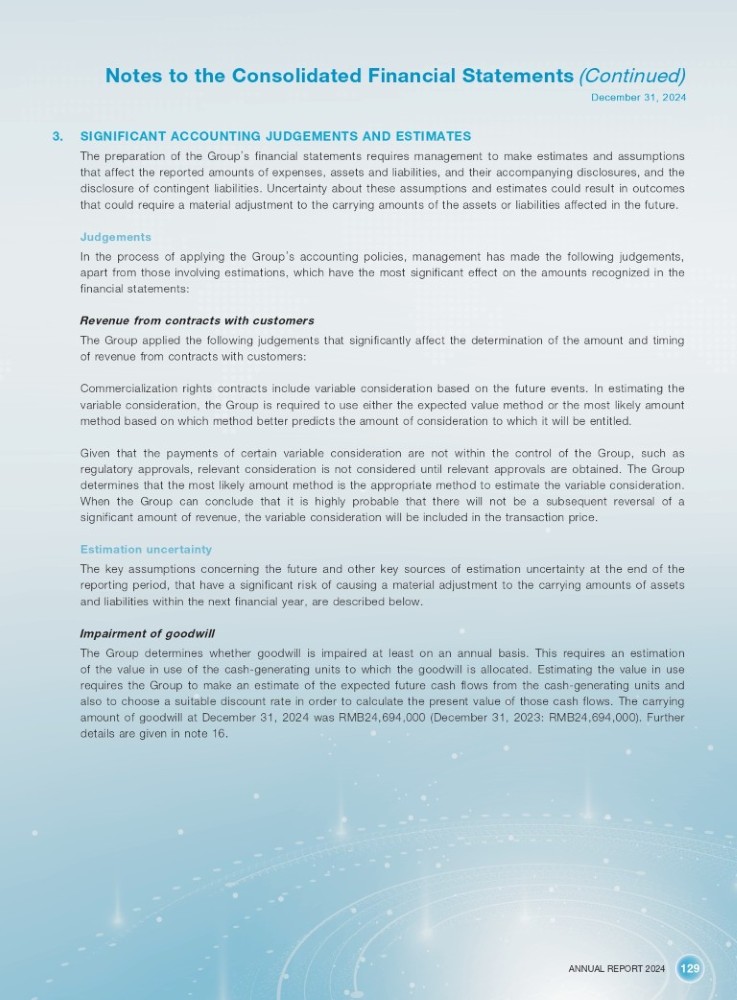 ANNUAL REPORT 2024 129 Notes to the Consolidated Financial Statements (Continued) December 31, 2024 3. SIGNIFICANT ACCOUNTING JUDGEMENTS AND ESTIMATES The preparation of the Group ’ s financial statements requires management to make estimates and assumptions that affect the reported amounts of expenses, assets and liabilities, and their accompanying disclosures, and the disclosure of contingent liabilities . Uncertainty about these assumptions and estimates could result in outcomes that could require a material adjustment to the carrying amounts of the assets or liabilities affected in the future . Judgements In the process of applying the Group ’ s accounting policies, management has made the following judgements, apart from those involving estimations, which have the most significant effect on the amounts recognized in the financial statements : Revenue from contracts with customers The Group applied the following judgements that significantly affect the determination of the amount and timing of revenue from contracts with customers : Commercialization rights contracts include variable consideration based on the future events . In estimating the variable consideration, the Group is required to use either the expected value method or the most likely amount method based on which method better predicts the amount of consideration to which it will be entitled . Given that the payments of certain variable consideration are not within the control of the Group, such as regulatory approvals, relevant consideration is not considered until relevant approvals are obtained . The Group determines that the most likely amount method is the appropriate method to estimate the variable consideration . When the Group can conclude that it is highly probable that there will not be a subsequent reversal of a significant amount of revenue, the variable consideration will be included in the transaction price . Estimation uncertainty The key assumptions concerning the future and other key sources of estimation uncertainty at the end of the reporting period, that have a significant risk of causing a material adjustment to the carrying amounts of assets and liabilities within the next financial year, are described below . Impairment of goodwill The Group determines whether goodwill is impaired at least on an annual basis . This requires an estimation of the value in use of the cash - generating units to which the goodwill is allocated . Estimating the value in use requires the Group to make an estimate of the expected future cash flows from the cash - generating units and also to choose a suitable discount rate in order to calculate the present value of those cash flows . The carrying amount of goodwill at December 31 , 2024 was RMB 24 , 694 , 000 (December 31 , 2023 : RMB 24 , 694 , 000 ) . Further details are given in note 16 .