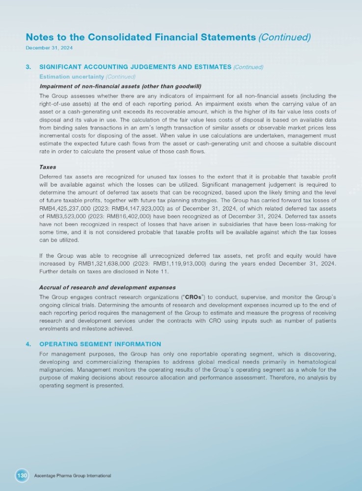 Ascentage Pharma Group International 130 Notes to the Consolidated Financial Statements (Continued) December 31, 2024 3. SIGNIFICANT ACCOUNTING JUDGEMENTS AND ESTIMATES (Continued) Estimation uncertainty (Continued) Impairment of non - financial assets (other than goodwill) The Group assesses whether there are any indicators of impairment for all non - financial assets (including the right - of - use assets) at the end of each reporting period . An impairment exists when the carrying value of an asset or a cash - generating unit exceeds its recoverable amount, which is the higher of its fair value less costs of disposal and its value in use . The calculation of the fair value less costs of disposal is based on available data from binding sales transactions in an arm ’ s length transaction of similar assets or observable market prices less incremental costs for disposing of the asset . When value in use calculations are undertaken, management must estimate the expected future cash flows from the asset or cash - generating unit and choose a suitable discount rate in order to calculate the present value of those cash flows . Taxes Deferred tax assets are recognized for unused tax losses to the extent that it is probable that taxable profit will be available against which the losses can be utilized . Significant management judgement is required to determine the amount of deferred tax assets that can be recognized, based upon the likely timing and the level of future taxable profits, together with future tax planning strategies . The Group has carried forward tax losses of RMB 4 , 425 , 237 , 000 ( 2023 : RMB 4 , 147 , 923 , 000 ) as of December 31 , 2024 , of which related deferred tax assets of RMB 3 , 523 , 000 ( 2023 : RMB 16 , 402 , 000 ) have been recognized as of December 31 , 2024 . Deferred tax assets have not been recognized in respect of losses that have arisen in subsidiaries that have been loss - making for some time, and it is not considered probable that taxable profits will be available against which the tax losses can be utilized . If the Group was able to recognise all unrecognized deferred tax assets, net profit and equity would have increased by RMB 1 , 321 , 638 , 000 ( 2023 : RMB 1 , 119 , 913 , 000 ) during the years ended December 31 , 2024 . Further details on taxes are disclosed in Note 11 . Accrual of research and development expenses The Group engages contract research organizations ( “ CROs ” ) to conduct, supervise, and monitor the Group ’ s ongoing clinical trials . Determining the amounts of research and development expenses incurred up to the end of each reporting period requires the management of the Group to estimate and measure the progress of receiving research and development services under the contracts with CRO using inputs such as number of patients enrolments and milestone achieved . 4. OPERATING SEGMENT INFORMATION For management purposes, the Group has only one reportable operating segment, which is discovering, developing and commercializing therapies to address global medical needs primarily in hematological malignancies . Management monitors the operating results of the Group ’ s operating segment as a whole for the purpose of making decisions about resource allocation and performance assessment . Therefore, no analysis by operating segment is presented .