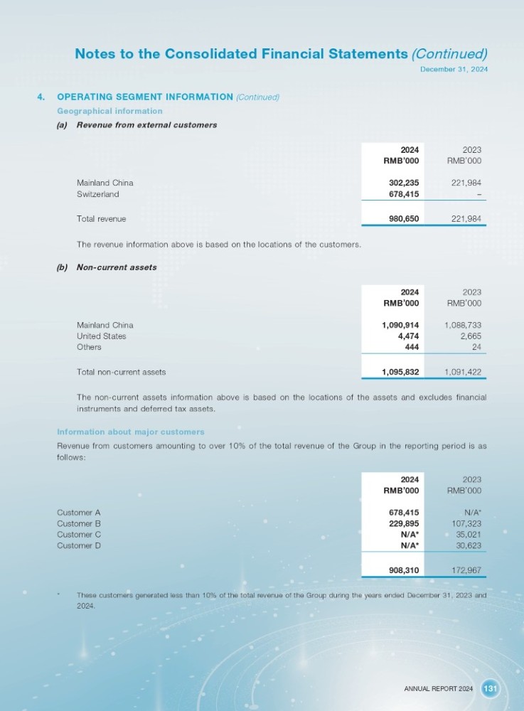 ANNUAL REPORT 2024 131 Notes to the Consolidated Financial Statements (Continued) December 31, 2024 4. OPERATING SEGMENT INFORMATION (Continued) Geographical information (a) Revenue from external customers 2023 2024 RMB ’ 000 RMB ’ 000 221,984 302,235 – 678,415 221,984 980,650 Mainland China Switzerland Total revenue The revenue information above is based on the locations of the customers. (b) Non - current assets 2023 2024 RMB ’ 000 RMB ’ 000 1,088,733 1,090,914 2,665 4,474 24 444 1,091,422 1,095,832 Mainland China United States Others Total non - current assets The non - current assets information above is based on the locations of the assets and excludes financial instruments and deferred tax assets. Information about major customers Revenue from customers amounting to over 10% of the total revenue of the Group in the reporting period is as follows: Customer A Customer B Customer C Customer D 2023 2024 RMB ’ 000 RMB ’ 000 N/A* 678,415 107,323 229,895 35,021 N/A* 30,623 N/A* 172,967 908,310 * These customers generated less than 10% of the total revenue of the Group during the years ended December 31, 2023 and 2024.