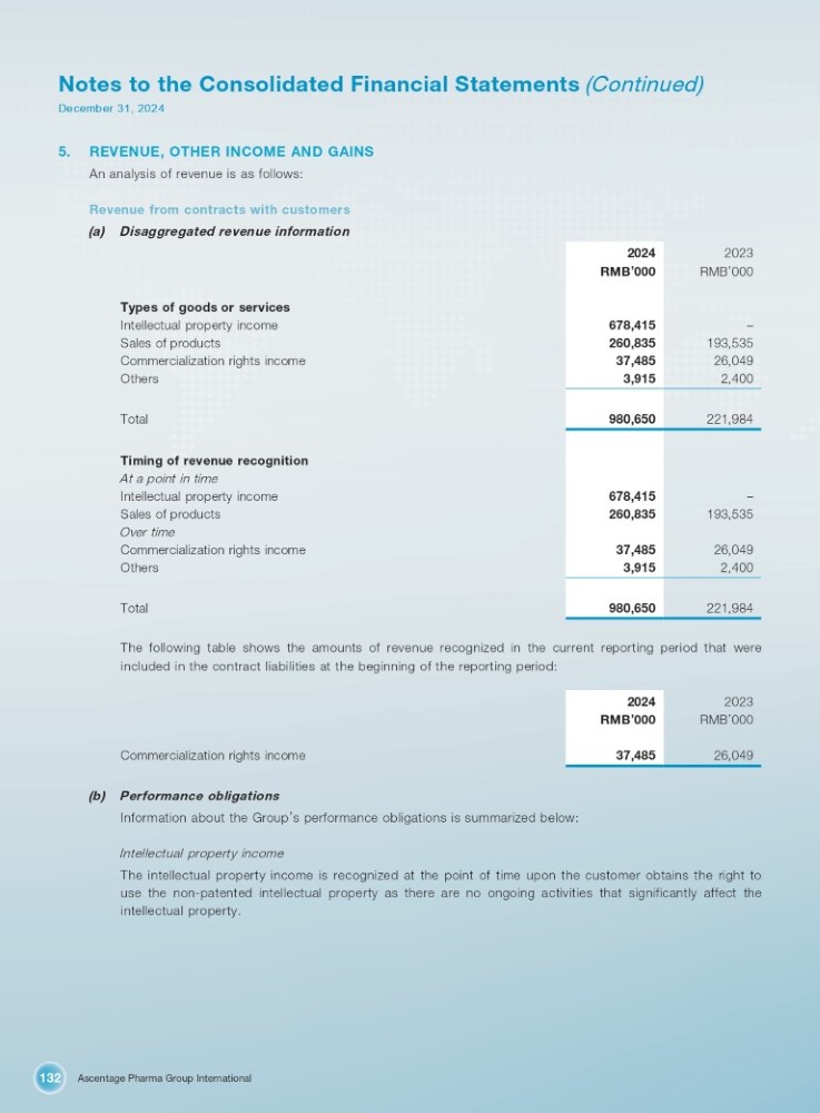 Ascentage Pharma Group International 132 Notes to the Consolidated Financial Statements (Continued) December 31, 2024 5. REVENUE, OTHER INCOME AND GAINS An analysis of revenue is as follows: Revenue from contracts with customers (a) Disaggregated revenue information 2023 2024 RMB ’ 000 RMB ’ 000 – 678,415 193,535 260,835 26,049 37,485 2,400 3,915 221,984 980,650 – 678,415 193,535 260,835 26,049 37,485 2,400 3,915 221,984 980,650 Types of goods or services Intellectual property income Sales of products Commercialization rights income Others Total Timing of revenue recognition At a point in time Intellectual property income Sales of products Over time Commercialization rights income Others Total The following table shows the amounts of revenue recognized in the current reporting period that were included in the contract liabilities at the beginning of the reporting period: 2023 RMB ’ 000 2024 RMB ’ 000 26,049 37,485 Commercialization rights income (b) Performance obligations Information about the Group ’ s performance obligations is summarized below: Intellectual property income The intellectual property income is recognized at the point of time upon the customer obtains the right to use the non - patented intellectual property as there are no ongoing activities that significantly affect the intellectual property .