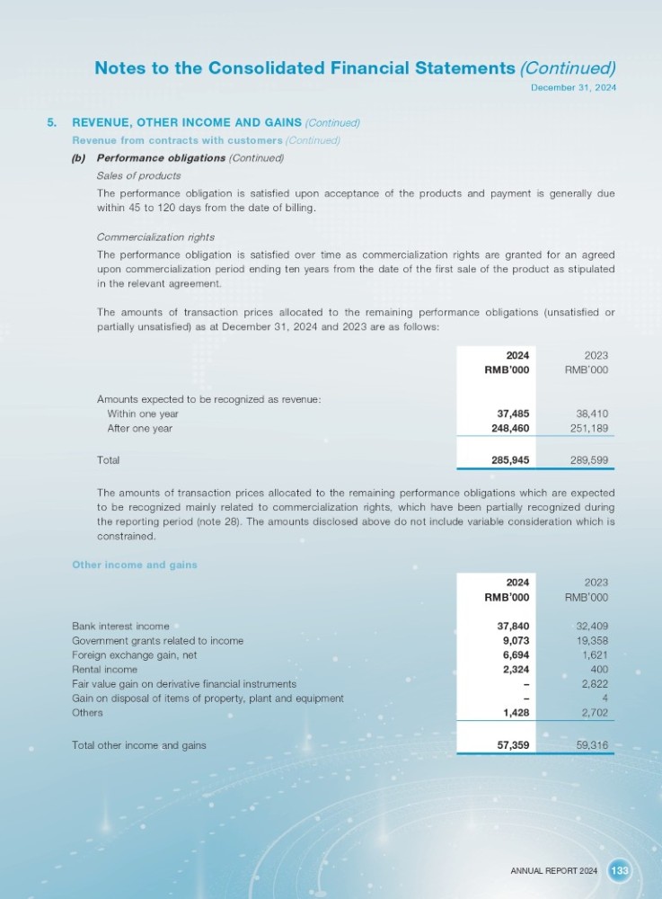 ANNUAL REPORT 2024 133 Notes to the Consolidated Financial Statements (Continued) December 31, 2024 5. REVENUE, OTHER INCOME AND GAINS (Continued) Revenue from contracts with customers (Continued) (b) Performance obligations (Continued) Sales of products The performance obligation is satisfied upon acceptance of the products and payment is generally due within 45 to 120 days from the date of billing . Commercialization rights The performance obligation is satisfied over time as commercialization rights are granted for an agreed upon commercialization period ending ten years from the date of the first sale of the product as stipulated in the relevant agreement . The amounts of transaction prices allocated to the remaining performance obligations (unsatisfied or partially unsatisfied) as at December 31 , 2024 and 2023 are as follows : 2023 2024 RMB ’ 000 RMB ’ 000 38,410 37,485 251,189 248,460 289,599 285,945 Amounts expected to be recognized as revenue: Within one year After one year Total The amounts of transaction prices allocated to the remaining performance obligations which are expected to be recognized mainly related to commercialization rights, which have been partially recognized during the reporting period (note 28 ) . The amounts disclosed above do not include variable consideration which is constrained . Other income and gains Bank interest income Government grants related to income Foreign exchange gain, net Rental income Fair value gain on derivative financial instruments Gain on disposal of items of property, plant and equipment Others Total other income and gains 2023 2024 RMB ’ 000 RMB ’ 000 32,409 37,840 19,358 9,073 1,621 6,694 400 2,324 2,822 – 4 – 2,702 1,428 59,316 57,359