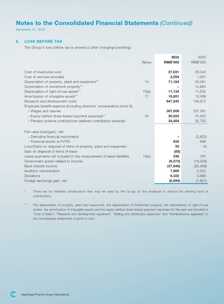 Ascentage Pharma Group International 134 Notes to the Consolidated Financial Statements (Continued) December 31, 2024 6. LOSS BEFORE TAX The Group ’ s loss before tax is arrived at after charging/(crediting): Notes 14 15(a) 17 34 Cost of inventories sold Cost of services provided Depreciation of property, plant and equipment** Depreciation of investment property** Depreciation of right - of - use assets** Amortization of intangible assets** Research and development costs Employee benefit expense (including directors ’ remuneration) (note 9): – Wages and salaries – Equity - settled share - based payment expenses** – Pension scheme contributions (defined contribution scheme)* 15(c) Fair value loss/(gain), net: – Derivative financial instruments – Financial assets at FVTPL Loss/(Gain) on disposal of items of property, plant and equipment Gain on disposal of items of lease Lease payments not included in the measurement of lease liabilities Government grants related to income Bank interest income Auditors ’ remuneration Donations Foreign exchange gain, net 2023 2024 RMB ’ 000 RMB ’ 000 29,342 27,031 1,201 2,054 55,281 71,184 15,883 – 11,632 11,134 10,399 10,851 706,972 947,245 337,381 367,008 31,503 20,924 30,705 34,404 (2,822) – 699 832 (4) 50 – (85) 181 238 (19,358) (9,073) (32,409) (37,840) 2,550 7,900 3,988 6,322 (1,621) (6,694) * There are no forfeited contributions that may be used by the Group as the employer to reduce the existing level of contributions . ** The depreciation of property, plant and equipment, the depreciation of investment property, the depreciation of right - of - use assets, the amortization of intangible assets and the equity - settled share - based payment expenses for the year are included in “ Cost of Sales ” , “ Research and development expenses ” , “ Selling and distribution expenses ” and “ Administrative expenses ” in the consolidated statements of profit or loss .