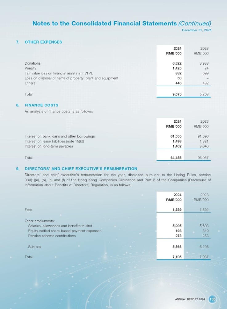 ANNUAL REPORT 2024 135 Notes to the Consolidated Financial Statements (Continued) December 31, 2024 7. OTHER EXPENSES 2023 2024 RMB ’ 000 RMB ’ 000 3,988 6,322 24 1,425 699 832 – 50 492 446 5,203 9,075 Donations Penalty Fair value loss on financial assets at FVTPL Loss on disposal of items of property, plant and equipment Others Total 8. FINANCE COSTS An analysis of finance costs is as follows: 2023 2024 RMB ’ 000 RMB ’ 000 91,690 61,555 1,321 1,498 3,046 1,402 96,057 64,455 Interest on bank loans and other borrowings Interest on lease liabilities (note 15(b)) Interest on long - term payables Total 9. DIRECTORS ’ AND CHIEF EXECUTIVE ’ S REMUNERATION Directors ’ and chief executive ’ s remuneration for the year, disclosed pursuant to the Listing Rules, section 383 ( 1 )(a), (b), (c) and (f) of the Hong Kong Companies Ordinance and Part 2 of the Companies (Disclosure of Information about Benefits of Directors) Regulation, is as follows : Fees Other emoluments: Salaries, allowances and benefits in kind Equity - settled share - based payment expenses Pension scheme contributions Subtotal Total 2023 2024 RMB ’ 000 RMB ’ 000 1,692 1,539 5,693 5,095 349 198 253 273 6,295 5,566 7,987 7,105