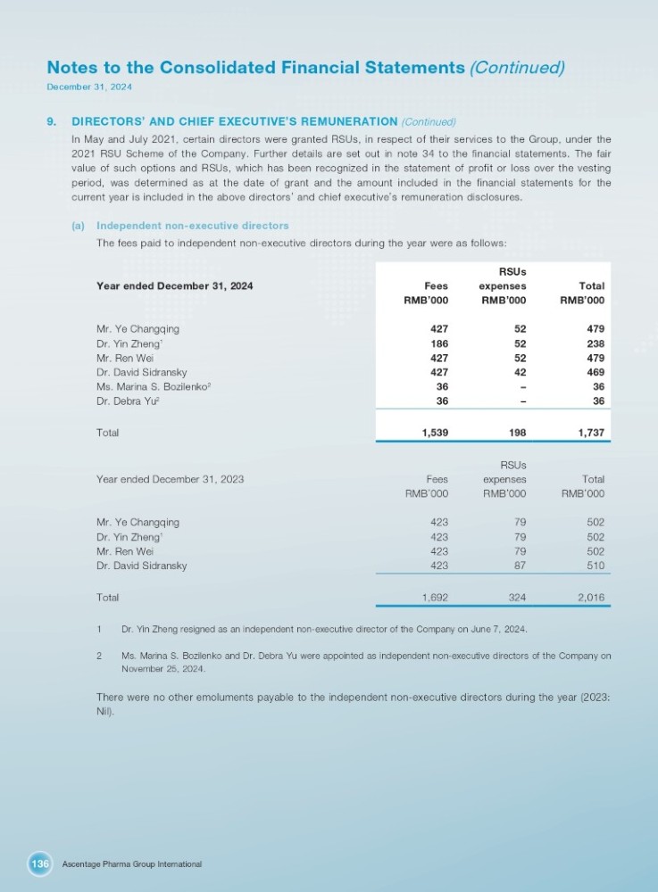 Ascentage Pharma Group International 136 Notes to the Consolidated Financial Statements (Continued) December 31, 2024 9. DIRECTORS ’ AND CHIEF EXECUTIVE ’ S REMUNERATION (Continued) In May and July 2021 , certain directors were granted RSUs, in respect of their services to the Group, under the 2021 RSU Scheme of the Company . Further details are set out in note 34 to the financial statements . The fair value of such options and RSUs, which has been recognized in the statement of profit or loss over the vesting period, was determined as at the date of grant and the amount included in the financial statements for the current year is included in the above directors ’ and chief executive ’ s remuneration disclosures . (a) Independent non - executive directors The fees paid to independent non - executive directors during the year were as follows: RSUs Total expenses Fees Year ended December 31, 2024 RMB ’ 000 RMB ’ 000 RMB ’ 000 479 52 427 Mr. Ye Changqing 238 52 186 Dr. Yin Zheng 1 479 52 427 Mr. Ren Wei 469 42 427 Dr. David Sidransky 36 – 36 Ms. Marina S. Bozilenko 2 36 – 36 Dr. Debra Yu 2 1,737 198 1,539 Total RSUs Total RMB ’ 000 expenses RMB ’ 000 Fees RMB ’ 000 Year ended December 31, 2023 502 79 423 Mr. Ye Changqing 502 79 423 Dr. Yin Zheng 1 502 79 423 Mr. Ren Wei 510 87 423 Dr. David Sidransky 2,016 324 1,692 Total 1 Dr. Yin Zheng resigned as an independent non - executive director of the Company on June 7, 2024. 2 Ms. Marina S. Bozilenko and Dr. Debra Yu were appointed as independent non - executive directors of the Company on November 25, 2024. There were no other emoluments payable to the independent non - executive directors during the year (2023: Nil).