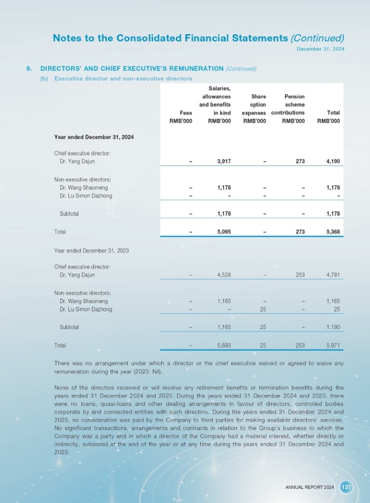 ANNUAL REPORT 2024 137 Notes to the Consolidated Financial Statements (Continued) December 31, 2024 9. DIRECTORS ’ AND CHIEF EXECUTIVE ’ S REMUNERATION (Continued) (b) Executive director and non - executive directors Salaries, Pension Share allowances scheme option and benefits Total contributions expenses in kind Fees RMB ’ 000 RMB ’ 000 RMB ’ 000 RMB ’ 000 RMB ’ 000 4,190 273 – 3,917 – 1,178 – – 1,178 – – – – – – 1,178 – – 1,178 – 5,368 273 – 5,095 – Year ended December 31, 2024 Chief executive director: Dr. Yang Dajun Non - executive directors: Dr. Wang Shaomeng Dr. Lu Simon Dazhong Subtotal Total Year ended December 31, 2023 Chief executive director: 4,781 253 – 4,528 – Dr. Yang Dajun 1,165 – – 1,165 – Non - executive directors: Dr. Wang Shaomeng 25 – 25 – – Dr. Lu Simon Dazhong 1,190 – 25 1,165 – Subtotal 5,971 253 25 5,693 – Total There was no arrangement under which a director or the chief executive waived or agreed to waive any remuneration during the year ( 2023 : Nil) . None of the directors received or will receive any retirement benefits or termination benefits during the years ended 31 December 2024 and 2023 . During the years ended 31 December 2024 and 2023 , there were no loans, quasi - loans and other dealing arrangements in favour of directors, controlled bodies corporate by and connected entities with such directors . During the years ended 31 December 2024 and 2023 , no consideration was paid by the Company to third parties for making available directors ’ services . No significant transactions, arrangements and contracts in relation to the Group ’ s business to which the Company was a party and in which a director of the Company had a material interest, whether directly or indirectly, subsisted at the end of the year or at any time during the years ended 31 December 2024 and 2023 .
