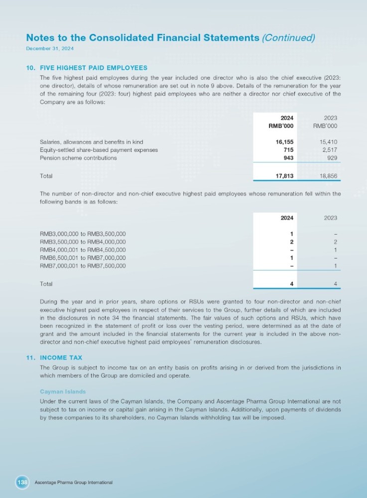 Ascentage Pharma Group International 138 Notes to the Consolidated Financial Statements (Continued) December 31, 2024 10. FIVE HIGHEST PAID EMPLOYEES The five highest paid employees during the year included one director who is also the chief executive ( 2023 : one director), details of whose remuneration are set out in note 9 above . Details of the remuneration for the year of the remaining four ( 2023 : four) highest paid employees who are neither a director nor chief executive of the Company are as follows : 2023 2024 RMB ’ 000 RMB ’ 000 15,410 16,155 2,517 715 929 943 18,856 17,813 Salaries, allowances and benefits in kind Equity - settled share - based payment expenses Pension scheme contributions Total The number of non - director and non - chief executive highest paid employees whose remuneration fell within the following bands is as follows: 2023 2024 – 1 RMB3,000,000 to RMB3,500,000 2 2 RMB3,500,000 to RMB4,000,000 1 – RMB4,000,001 to RMB4,500,000 – 1 RMB6,500,001 to RMB7,000,000 1 – RMB7,000,001 to RMB7,500,000 4 4 Total During the year and in prior years, share options or RSUs were granted to four non - director and non - chief executive highest paid employees in respect of their services to the Group, further details of which are included in the disclosures in note 34 the financial statements . The fair values of such options and RSUs, which have been recognized in the statement of profit or loss over the vesting period, were determined as at the date of grant and the amount included in the financial statements for the current year is included in the above non - director and non - chief executive highest paid employees ’ remuneration disclosures . 11. INCOME TAX The Group is subject to income tax on an entity basis on profits arising in or derived from the jurisdictions in which members of the Group are domiciled and operate . Cayman Islands Under the current laws of the Cayman Islands, the Company and Ascentage Pharma Group International are not subject to tax on income or capital gain arising in the Cayman Islands . Additionally, upon payments of dividends by these companies to its shareholders, no Cayman Islands withholding tax will be imposed .