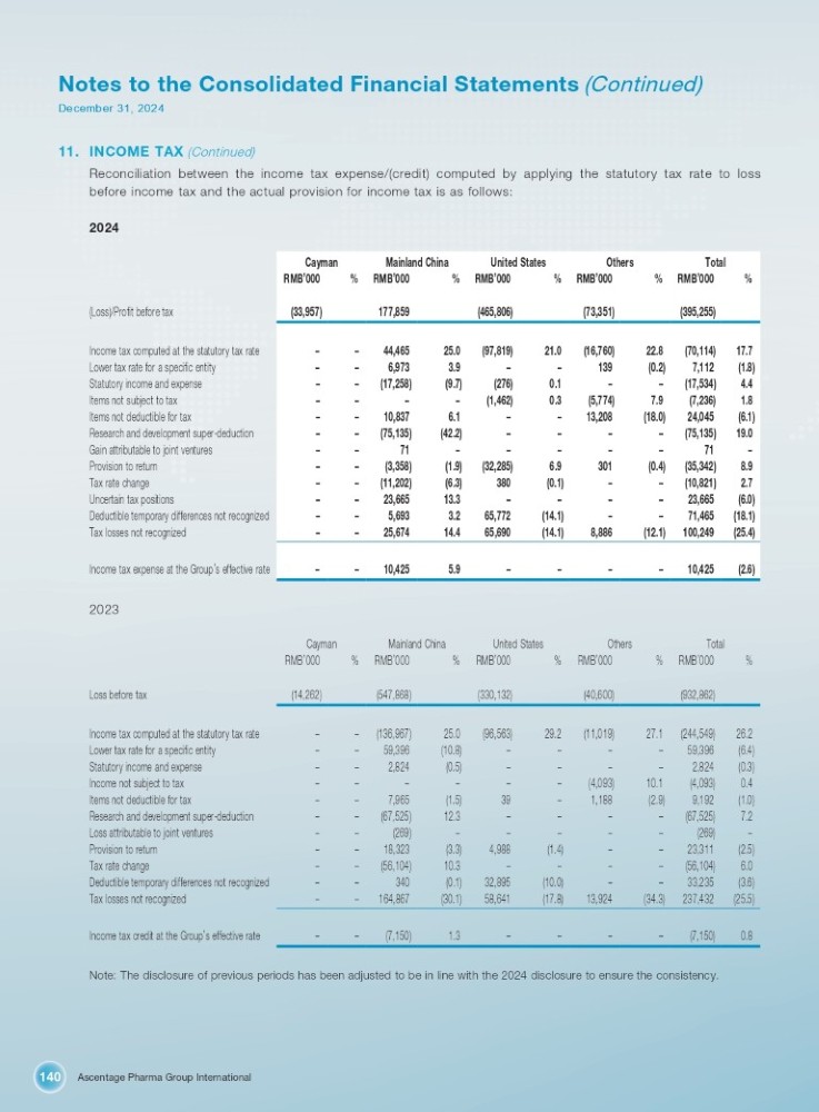 Ascentage Pharma Group International 140 Notes to the Consolidated Financial Statements (Continued) December 31, 2024 11. INCOME TAX (Continued) Reconciliation between the income tax expense/(credit) computed by applying the statutory tax rate to loss before income tax and the actual provision for income tax is as follows: 2024 % Total RMB ’ 000 (395,255) % Others RMB ’ 000 (73,351) United States RMB ’ 000 % (465,806) Mainland China RMB ’ 000 % 177,859 % Cayman RMB ’ 000 (33,957) (Loss)/Profit before tax 17.7 (70,114) 22.8 (16,760) 21.0 (97,819) 25.0 44,465 – – Income tax computed at the statutory tax rate (1.8) 7,112 (0.2) 139 – – 3.9 6,973 – – Lower tax rate for a specific entity 4.4 (17,534) – – 0.1 (276) (9.7) (17,258) – – Statutory income and expense 1.8 (7,236) 7.9 (5,774) 0.3 (1,462) – – – – Items not subject to tax (6.1) 24,045 (18.0) 13,208 – – 6.1 10,837 – – Items not deductible for tax 19.0 (75,135) – – – – (42.2) (75,135) – – Research and development super - deduction – 71 – – – – – 71 – – Gain attributable to joint ventures 8.9 (35,342) (0.4) 301 6.9 (32,285) (1.9) (3,358) – – Provision to return 2.7 (10,821) – – (0.1) 380 (6.3) (11,202) – – Tax rate change (6.0) 23,665 – – – – 13.3 23,665 – – Uncertain tax positions (18.1) 71,465 – – (14.1) 65,772 3.2 5,693 – – Deductible temporary differences not recognized (25.4) 100,249 (12.1) 8,886 (14.1) 65,690 14.4 25,674 – – Tax losses not recognized (2.6) 10,425 – – – – 5.9 10,425 – – Income tax expense at the Group ’ s effective rate 2023 % Total RMB ’ 000 % Others RMB ’ 000 % United States RMB ’ 000 Mainland China % RMB ’ 000 % Cayman RMB ’ 000 (932,862) (40,600) (330,132) (547,868) (14,262) Loss before tax 26.2 (244,549) 27.1 (11,019) 29.2 (96,563) – (136,967) 25.0 – Income tax computed at the statutory tax rate (6.4) 59,396 – – – – – 59,396 (10.8) – Lower tax rate for a specific entity (0.3) 2,824 – – – – – 2,824 (0.5) – Statutory income and expense 0.4 (4,093) 10.1 (4,093) – – – – – – Income not subject to tax (1.0) 9,192 (2.9) 1,188 – 39 – 7,965 (1.5) – Items not deductible for tax 7.2 (67,525) – – – – – (67,525) 12.3 – Research and development super - deduction – (269) – – – – – (269) – – Loss attributable to joint ventures (2.5) 23,311 – – (1.4) 4,988 – 18,323 (3.3) – Provision to return 6.0 (56,104) – – – – – (56,104) 10.3 – Tax rate change (3.6) 33,235 – – (10.0) 32,895 – 340 (0.1) – Deductible temporary differences not recognized (25.5) 237,432 (34.3) 13,924 (17.8) 58,641 – 164,867 (30.1) – Tax losses not recognized 0.8 (7,150) – – – – – (7,150) 1.3 – Income tax credit at the Group ’ s effective rate Note: The disclosure of previous periods has been adjusted to be in line with the 2024 disclosure to ensure the consistency.