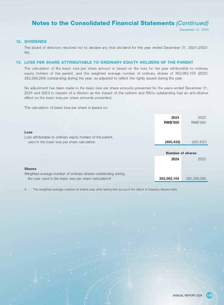 ANNUAL REPORT 2024 141 Notes to the Consolidated Financial Statements (Continued) December 31, 2024 12. DIVIDENDS The board of directors resolved not to declare any final dividend for the year ended December 31 , 2024 ( 2023 : Nil) . 13. LOSS PER SHARE ATTRIBUTABLE TO ORDINARY EQUITY HOLDERS OF THE PARENT The calculation of the basic loss per share amount is based on the loss for the year attributable to ordinary equity holders of the parent, and the weighted average number of ordinary shares of 302 , 062 , 104 ( 2023 : 282 , 299 , 269 ) outstanding during the year, as adjusted to reflect the rights issued during the year . No adjustment has been made to the basic loss per share amounts presented for the years ended December 31 , 2024 and 2023 in respect of a dilution as the impact of the options and RSUs outstanding had an anti - dilutive effect on the basic loss per share amounts presented . The calculation of basic loss per share is based on : 2024 RMB ’ 000 2023 RMB ’ 000 Loss Loss attributable to ordinary equity holders of the parent, used in the basic loss per share calculation (405,433) (925,637) Number of shares 2023 2024 282,299,269 Shares Weighted average number of ordinary shares outstanding during the year used in the basic loss per share calculation# 302,062,104 # The weighted average number of shares was after taking into account the effect of treasury shares held.