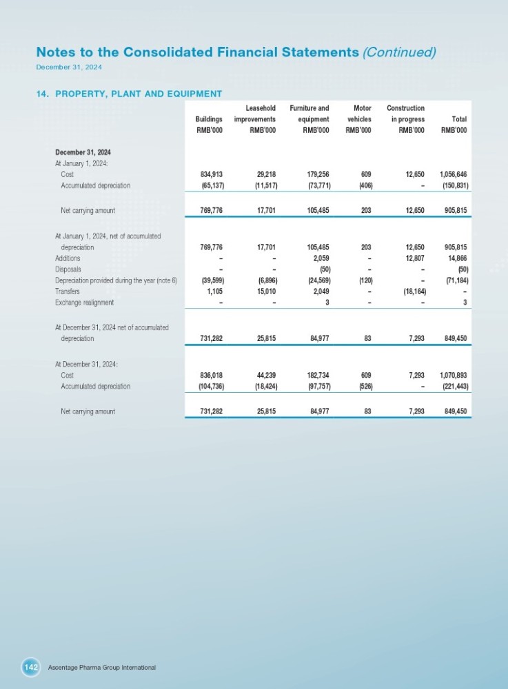Ascentage Pharma Group International 142 Notes to the Consolidated Financial Statements (Continued) December 31, 2024 14. PROPERTY, PLANT AND EQUIPMENT December 31, 2024 At January 1, 2024: Cost Accumulated depreciation Net carrying amount At January 1, 2024, net of accumulated depreciation Additions Disposals Depreciation provided during the year (note 6) Transfers Exchange realignment At December 31, 2024 net of accumulated depreciation At December 31, 2024: Cost Accumulated depreciation Net carrying amount Construction Motor Furniture and Leasehold Total in progress vehicles equipment improvements Buildings RMB ’ 000 RMB ’ 000 RMB ’ 000 RMB ’ 000 RMB ’ 000 RMB ’ 000 1,056,646 12,650 609 179,256 29,218 834,913 (150,831) – (406) (73,771) (11,517) (65,137) 905,815 12,650 203 105,485 17,701 769,776 905,815 12,650 203 105,485 17,701 769,776 14,866 12,807 – 2,059 – – (50) – – (50) – – (71,184) – (120) (24,569) (6,896) (39,599) – (18,164) – 2,049 15,010 1,105 3 – – 3 – – 849,450 7,293 83 84,977 25,815 731,282 1,070,893 7,293 609 182,734 44,239 836,018 (221,443) – (526) (97,757) (18,424) (104,736) 849,450 7,293 83 84,977 25,815 731,282