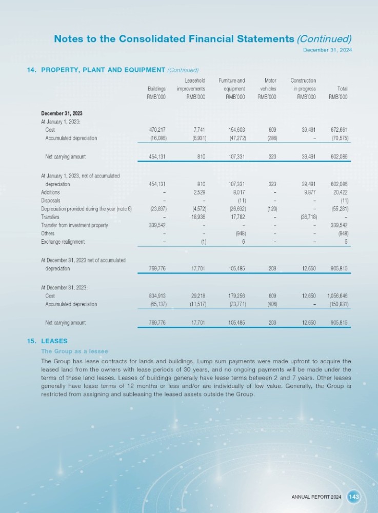 ANNUAL REPORT 2024 143 Notes to the Consolidated Financial Statements (Continued) December 31, 2024 14. PROPERTY, PLANT AND EQUIPMENT (Continued) Total Construction in progress Motor vehicles Furniture and equipment Leasehold improvements Buildings RMB ’ 000 RMB ’ 000 RMB ’ 000 RMB ’ 000 RMB ’ 000 RMB ’ 000 December 31, 2023 At January 1, 2023: 672,661 39,491 609 154,603 7,741 470,217 Cost (70,575) – (286) (47,272) (6,931) (16,086) Accumulated depreciation 602,086 39,491 323 107,331 810 454,131 Net carrying amount At January 1, 2023, net of accumulated 602,086 39,491 323 107,331 810 454,131 depreciation 20,422 9,877 – 8,017 2,528 – Additions (11) – – (11) – – Disposals (55,281) – (120) (26,692) (4,572) (23,897) Depreciation provided during the year (note 6) – (36,718) – 17,782 18,936 – Transfers 339,542 – – – – 339,542 Transfer from investment property (948) – – (948) – – Others 5 – – 6 (1) – Exchange realignment At December 31, 2023 net of accumulated 905,815 12,650 203 105,485 17,701 769,776 depreciation At December 31, 2023: 1,056,646 12,650 609 179,256 29,218 834,913 Cost (150,831) – (406) (73,771) (11,517) (65,137) Accumulated depreciation 905,815 12,650 203 105,485 17,701 769,776 Net carrying amount 15. LEASES The Group as a lessee The Group has lease contracts for lands and buildings . Lump sum payments were made upfront to acquire the leased land from the owners with lease periods of 30 years, and no ongoing payments will be made under the terms of these land leases . Leases of buildings generally have lease terms between 2 and 7 years . Other leases generally have lease terms of 12 months or less and/or are individually of low value . Generally, the Group is restricted from assigning and subleasing the leased assets outside the Group .
