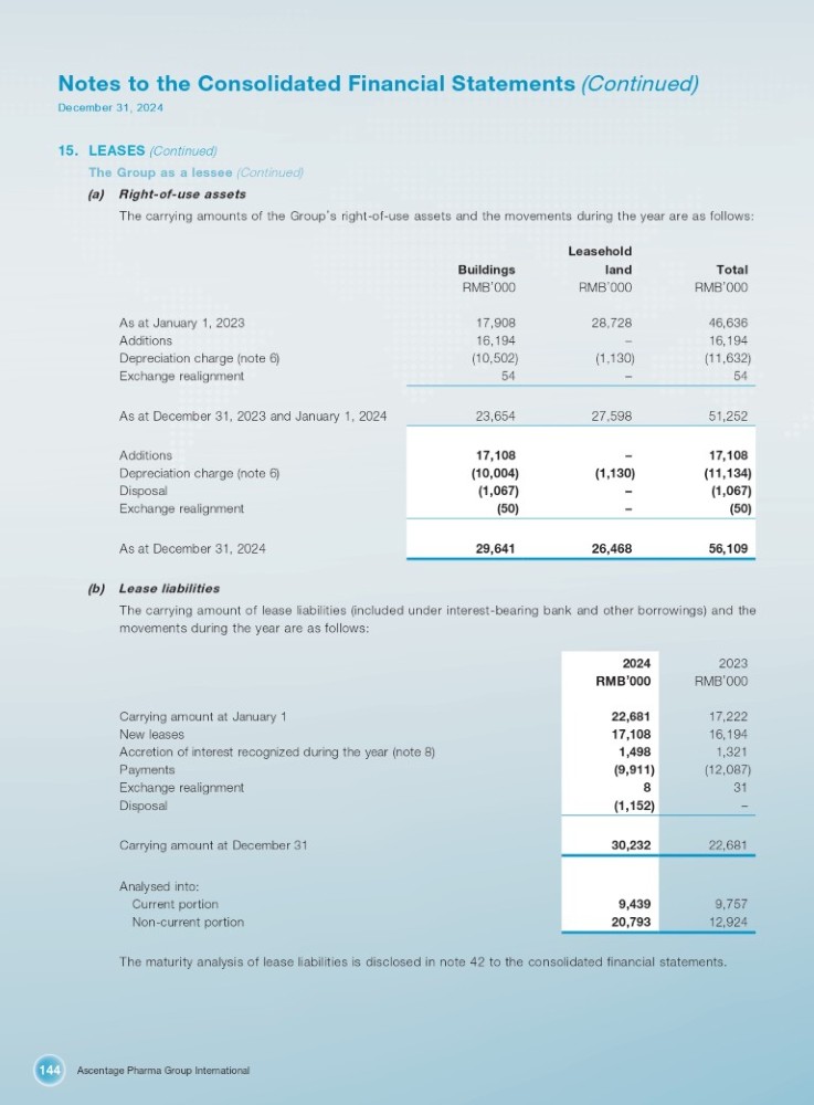 Ascentage Pharma Group International 144 Notes to the Consolidated Financial Statements (Continued) December 31, 2024 15. LEASES (Continued) The Group as a lessee (Continued) (a) Right - of - use assets The carrying amounts of the Group ’ s right - of - use assets and the movements during the year are as follows: Total Leasehold land Buildings RMB ’ 000 RMB ’ 000 RMB ’ 000 46,636 28,728 17,908 As at January 1, 2023 16,194 – 16,194 Additions (11,632) (1,130) (10,502) Depreciation charge (note 6) 54 – 54 Exchange realignment 51,252 27,598 23,654 As at December 31, 2023 and January 1, 2024 17,108 – 17,108 Additions (11,134) (1,130) (10,004) Depreciation charge (note 6) (1,067) – (1,067) Disposal (50) – (50) Exchange realignment 56,109 26,468 29,641 As at December 31, 2024 (b) Lease liabilities The carrying amount of lease liabilities (included under interest - bearing bank and other borrowings) and the movements during the year are as follows: 2023 2024 RMB ’ 000 RMB ’ 000 17,222 22,681 16,194 17,108 1,321 1,498 (12,087) (9,911) 31 8 – (1,152) 22,681 30,232 9,757 9,439 12,924 20,793 Carrying amount at January 1 New leases Accretion of interest recognized during the year (note 8) Payments Exchange realignment Disposal Carrying amount at December 31 Analysed into: Current portion Non - current portion The maturity analysis of lease liabilities is disclosed in note 42 to the consolidated financial statements.