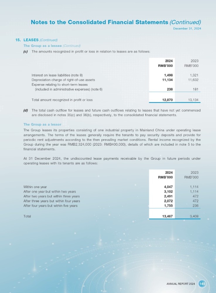 ANNUAL REPORT 2024 145 Notes to the Consolidated Financial Statements (Continued) December 31, 2024 15. LEASES (Continued) The Group as a lessee (Continued) (c) The amounts recognized in profit or loss in relation to leases are as follows: 2023 2024 RMB ’ 000 RMB ’ 000 1,321 1,498 11,632 11,134 181 238 13,134 12,870 Interest on lease liabilities (note 8) Depreciation charge of right - of - use assets Expense relating to short - term leases (included in administrative expenses) (note 6) Total amount recognized in profit or loss (d) The total cash outflow for leases and future cash outflows relating to leases that have not yet commenced are disclosed in notes 35(c) and 36(b), respectively, to the consolidated financial statements. The Group as a lessor The Group leases its properties consisting of one industrial property in Mainland China under operating lease arrangements . The terms of the leases generally require the tenants to pay security deposits and provide for periodic rent adjustments according to the then prevailing market conditions . Rental income recognized by the Group during the year was RMB 2 , 324 , 000 ( 2023 : RMB 400 , 000 ), details of which are included in note 5 to the financial statements . At 31 December 2024 , the undiscounted lease payments receivable by the Group in future periods under operating leases with its tenants are as follows : Within one year After one year but within two years After two years but within three years After three years but within four years After four years but within five years Total 2023 2024 RMB ’ 000 RMB ’ 000 1,114 4,047 1,114 3,102 472 2,491 472 2,072 236 1,755 3,408 13,467