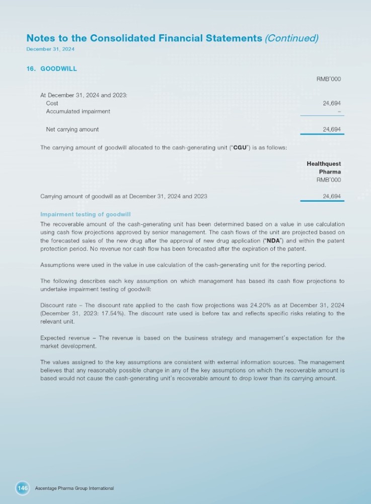 Ascentage Pharma Group International 146 Notes to the Consolidated Financial Statements (Continued) December 31, 2024 16. GOODWILL RMB ’ 000 24,694 At December 31, 2024 and 2023: Cost Accumulated impairment – Net carrying amount 24,694 The carrying amount of goodwill allocated to the cash - generating unit ( “ CGU ” ) is as follows: Healthquest Pharma RMB ’ 000 Carrying amount of goodwill as at December 31, 2024 and 2023 24,694 Impairment testing of goodwill The recoverable amount of the cash - generating unit has been determined based on a value in use calculation using cash flow projections approved by senior management . The cash flows of the unit are projected based on the forecasted sales of the new drug after the approval of new drug application ( “ NDA ” ) and within the patent protection period . No revenue nor cash flow has been forecasted after the expiration of the patent . Assumptions were used in the value in use calculation of the cash - generating unit for the reporting period. The following describes each key assumption on which management has based its cash flow projections to undertake impairment testing of goodwill : Discount rate – The discount rate applied to the cash flow projections was 24 . 20 % as at December 31 , 2024 (December 31 , 2023 : 17 . 54 % ) . The discount rate used is before tax and reflects specific risks relating to the relevant unit . Expected revenue – The revenue is based on the business strategy and management ’ s expectation for the market development . The values assigned to the key assumptions are consistent with external information sources . The management believes that any reasonably possible change in any of the key assumptions on which the recoverable amount is based would not cause the cash - generating unit ’ s recoverable amount to drop lower than its carrying amount .