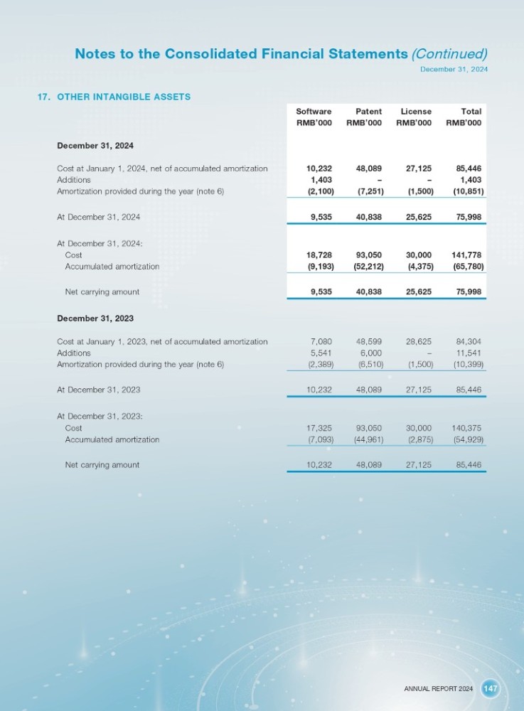 ANNUAL REPORT 2024 147 Notes to the Consolidated Financial Statements (Continued) December 31, 2024 17. OTHER INTANGIBLE ASSETS December 31, 2024 Cost at January 1, 2024, net of accumulated amortization Additions Amortization provided during the year (note 6) At December 31, 2024 At December 31, 2024: Cost Accumulated amortization Net carrying amount Total License Patent Software RMB ’ 000 RMB ’ 000 RMB ’ 000 RMB ’ 000 85,446 27,125 48,089 10,232 1,403 – – 1,403 (10,851) (1,500) (7,251) (2,100) 75,998 25,625 40,838 9,535 141,778 30,000 93,050 18,728 (65,780) (4,375) (52,212) (9,193) 75,998 25,625 40,838 9,535 December 31, 2023 84,304 28,625 48,599 7,080 Cost at January 1, 2023, net of accumulated amortization 11,541 – 6,000 5,541 Additions (10,399) (1,500) (6,510) (2,389) Amortization provided during the year (note 6) 85,446 27,125 48,089 10,232 At December 31, 2023 140,375 30,000 93,050 17,325 At December 31, 2023: Cost (54,929) (2,875) (44,961) (7,093) Accumulated amortization 85,446 27,125 48,089 10,232 Net carrying amount
