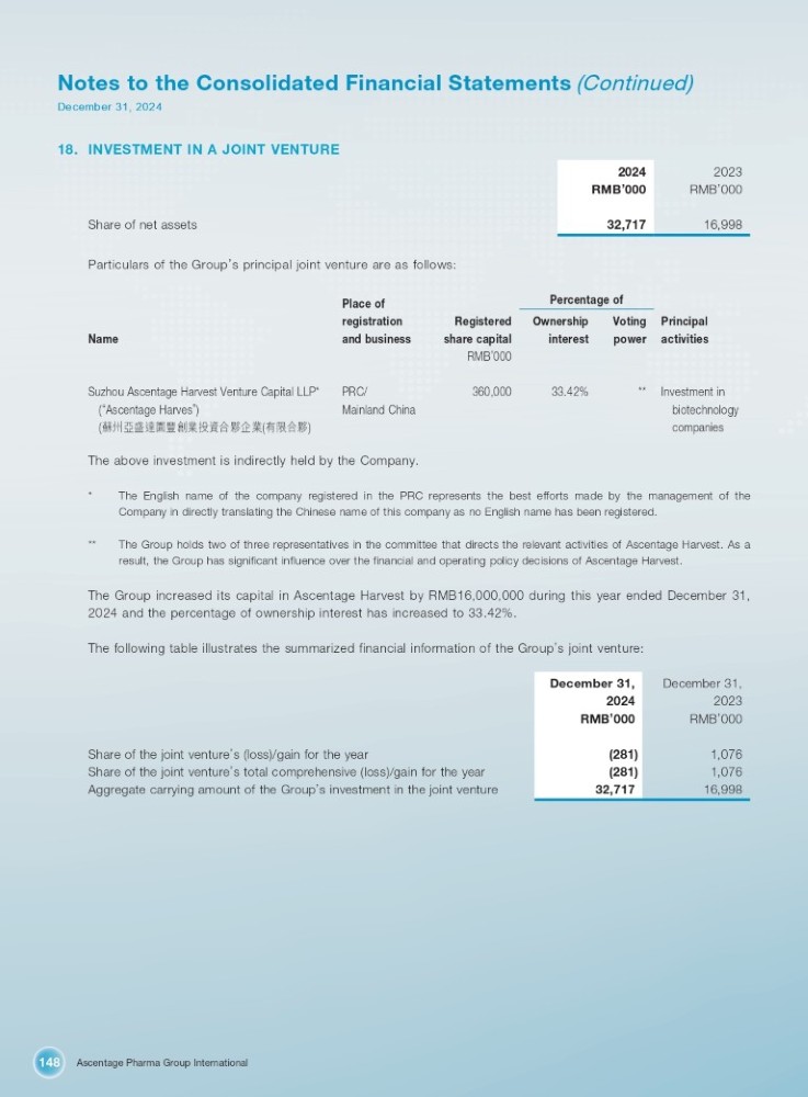 Ascentage Pharma Group International 148 Notes to the Consolidated Financial Statements (Continued) December 31, 2024 18. INVESTMENT IN A JOINT VENTURE 2023 RMB ’ 000 2024 RMB ’ 000 16,998 32,717 Share of net assets Particulars of the Group ’ s principal joint venture are as follows: Name Place of registration and business Percentage of Principal activities Ownership interest Voting power Registered share capital RMB ’ 000 Suzhou Ascentage Harvest Venture Capital LLP* ( “ Ascentage Harves ” ) ( 㰷ᐎӎⴋ䚄ൂ䊀ࢥᾝᣅ䋷ਸཕԱᾝ ( ᴹ䲀ਸཕ ) PRC/ Mainland China 360,000 33.42% ** Investment in biotechnology companies The above investment is indirectly held by the Company. * The English name of the company registered in the PRC represents the best efforts made by the management of the Company in directly translating the Chinese name of this company as no English name has been registered. ** The Group holds two of three representatives in the committee that directs the relevant activities of Ascentage Harvest. As a result, the Group has significant influence over the financial and operating policy decisions of Ascentage Harvest. The Group increased its capital in Ascentage Harvest by RMB16,000,000 during this year ended December 31, 2024 and the percentage of ownership interest has increased to 33.42%. The following table illustrates the summarized financial information of the Group ’ s joint venture: December 31, December 31, 2023 RMB ’ 000 2024 RMB ’ 000 1,076 (281) Share of the joint venture ’ s (loss)/gain for the year 1,076 (281) Share of the joint venture ’ s total comprehensive (loss)/gain for the year 16,998 32,717 Aggregate carrying amount of the Group ’ s investment in the joint venture