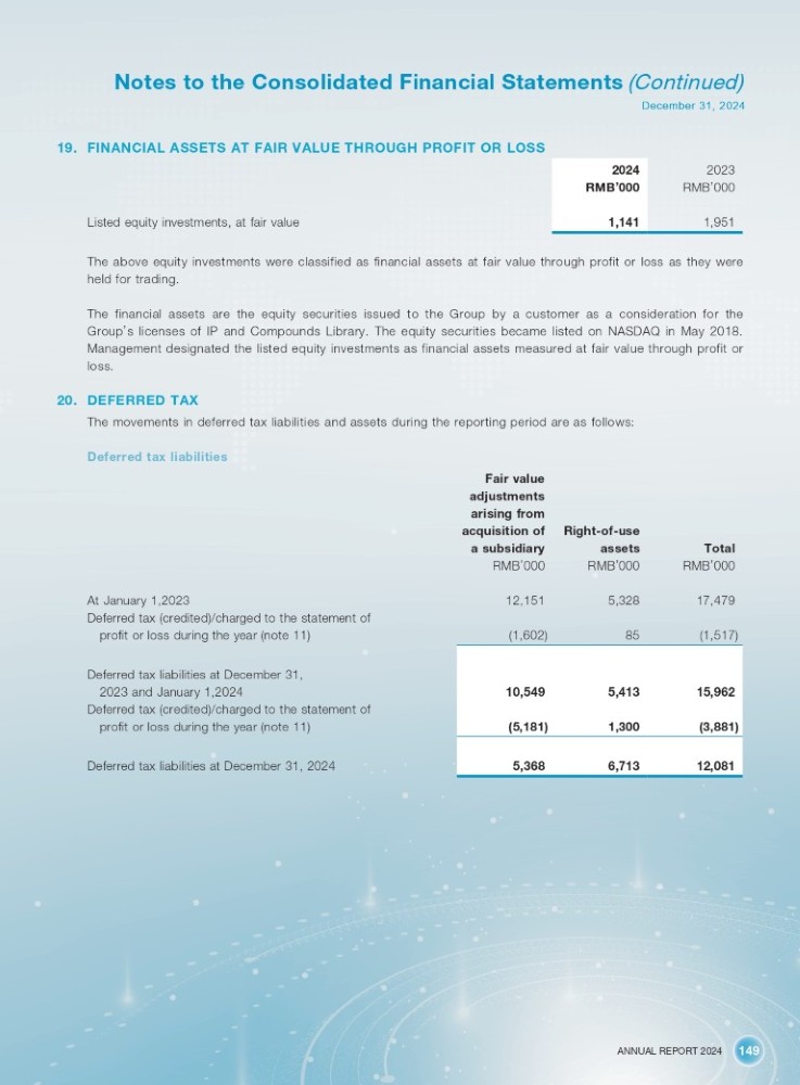 ANNUAL REPORT 2024 149 Notes to the Consolidated Financial Statements (Continued) December 31, 2024 19. FINANCIAL ASSETS AT FAIR VALUE THROUGH PROFIT OR LOSS 2023 RMB ’ 000 Listed equity investments, at fair value 2024 RMB ’ 000 1,141 1,951 The above equity investments were classified as financial assets at fair value through profit or loss as they were held for trading . The financial assets are the equity securities issued to the Group by a customer as a consideration for the Group ’ s licenses of IP and Compounds Library . The equity securities became listed on NASDAQ in May 2018 . Management designated the listed equity investments as financial assets measured at fair value through profit or loss . 20. DEFERRED TAX The movements in deferred tax liabilities and assets during the reporting period are as follows : Deferred tax liabilities Fair value adjustments arising from Right - of - use acquisition of Total RMB ’ 000 assets RMB ’ 000 a subsidiary RMB ’ 000 17,479 5,328 12,151 At January 1,2023 Deferred tax (credited)/charged to the statement of (1,517) 85 (1,602) profit or loss during the year (note 11) Deferred tax liabilities at December 31, 2023 and January 1,2024 Deferred tax (credited)/charged to the statement of profit or loss during the year (note 11) Deferred tax liabilities at December 31, 2024 15,962 (3,881) 5,413 1,300 10,549 (5,181) 12,081 6,713 5,368