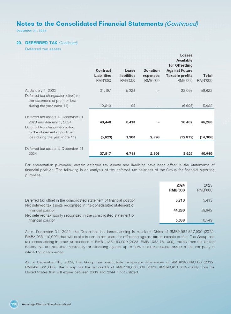 Ascentage Pharma Group International 150 Notes to the Consolidated Financial Statements (Continued) December 31, 2024 20. DEFERRED TAX (Continued) Deferred tax assets Losses Available for Offsetting Total Against Future Taxable profits Donation expenses Lease liabilities Contract Liabilities RMB ’ 000 RMB ’ 000 RMB ’ 000 RMB ’ 000 RMB ’ 000 59,622 23,097 – 5,328 31,197 At January 1, 2023 Deferred tax charged/(credited) to the statement of profit or loss 5,633 (6,695) – 85 12,243 during the year (note 11) 65,255 (14,306) 16,402 (12,879) – 2,896 5,413 1,300 43,440 (5,623) 50,949 3,523 2,896 6,713 37,817 Deferred tax assets at December 31, 2023 and January 1, 2024 Deferred tax charged/(credited) to the statement of profit or loss during the year (note 11) Deferred tax assets at December 31, 2024 For presentation purposes, certain deferred tax assets and liabilities have been offset in the statements of financial position . The following is an analysis of the deferred tax balances of the Group for financial reporting purposes : 2023 RMB ’ 000 2024 RMB ’ 000 5,413 6,713 Deferred tax offset in the consolidated statement of financial position 59,842 44,236 Net deferred tax assets recognized in the consolidated statement of financial position 10,549 5,368 Net deferred tax liability recognized in the consolidated statement of financial position As of December 31 , 2024 , the Group has tax losses arising in mainland China of RMB 2 , 963 , 587 , 000 ( 2023 : RMB 2 , 986 , 110 , 000 ) that will expire in one to ten years for offsetting against future taxable profits . The Group has tax losses arising in other jurisdictions of RMB 1 , 438 , 160 , 000 ( 2023 : RMB 1 , 052 , 461 , 000 ), mainly from the United States that are available indefinitely for offsetting against up to 80 % of future taxable profits of the company in which the losses arose . As of December 31 , 2024 , the Group has deductible temporary differences of RMB 828 , 668 , 000 ( 2023 : RMB 495 , 031 , 000 ) . The Group has the tax credits of RMB 120 , 606 , 000 ( 2023 : RMB 90 , 851 , 000 ) mainly from the United States that will expire between 2039 and 2044 if not utilized .