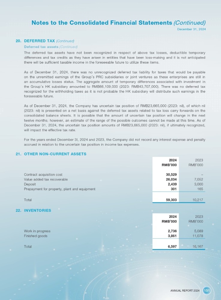 ANNUAL REPORT 2024 151 Notes to the Consolidated Financial Statements (Continued) December 31, 2024 20. DEFERRED TAX (Continued) Deferred tax assets (Continued) The deferred tax assets have not been recognized in respect of above tax losses, deductible temporary differences and tax credits as they have arisen in entities that have been loss - making and it is not anticipated there will be sufficient taxable income in the foreseeable future to utilize these items . As of December 31 , 2024 , there was no unrecognized deferred tax liability for taxes that would be payable on the unremitted earnings of the Group ’ s PRC subsidiaries or joint ventures as these enterprises are still in an accumulative losses status . The aggregate amount of temporary differences associated with investment in the Group ’ s HK subsidiary amounted to RMB 66 , 109 , 000 ( 2023 : RMB 43 , 707 , 000 ) . There was no deferred tax recognized for the withholding taxes as it is not probable the HK subsidiary will distribute such earnings in the foreseeable future . As of December 31 , 2024 , the Company has uncertain tax position of RMB 23 , 665 , 000 ( 2023 : nil), of which nil ( 2023 : nil) is presented on a net basis against the deferred tax assets related to tax loss carry forwards on the consolidated balance sheets . It is possible that the amount of uncertain tax position will change in the next twelve months ; however, an estimate of the range of the possible outcomes cannot be made at this time . As of December 31 , 2024 , the uncertain tax position amounts of RMB 23 , 665 , 000 ( 2023 : nil), if ultimately recognized, will impact the effective tax rate . For the years ended December 3 l, 2024 and 2023 , the Company did not record any interest expense and penalty accrued in relation to the uncertain tax position in income tax expenses . 21. OTHER NON - CURRENT ASSETS 2023 2024 RMB ’ 000 RMB ’ 000 – 30,529 7,052 26,034 3,000 2,439 165 301 10,217 59,303 Contract acquisition cost Value added tax recoverable Deposit Prepayment for property, plant and equipment Total 22. INVENTORIES Work in progress Finished goods Total 2023 2024 RMB ’ 000 RMB ’ 000 5,089 2,736 11,078 3,861 16,167 6,597