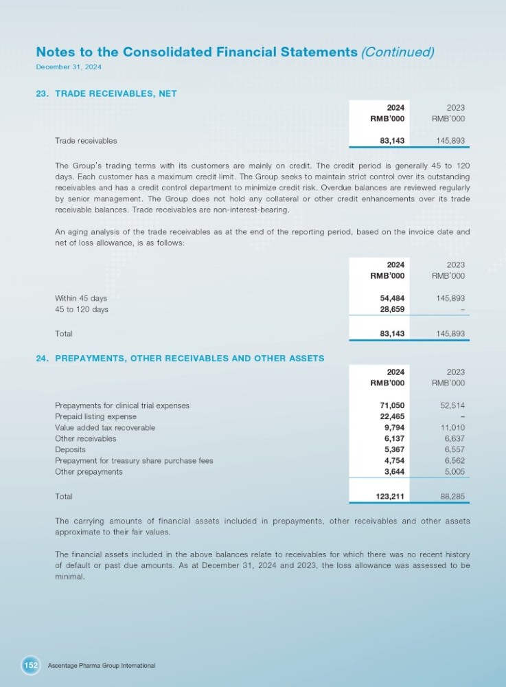 Ascentage Pharma Group International 152 Notes to the Consolidated Financial Statements (Continued) December 31, 2024 23. TRADE RECEIVABLES, NET 2023 RMB ’ 000 2024 RMB ’ 000 145,893 83,143 Trade receivables The Group ’ s trading terms with its customers are mainly on credit . The credit period is generally 45 to 120 days . Each customer has a maximum credit limit . The Group seeks to maintain strict control over its outstanding receivables and has a credit control department to minimize credit risk . Overdue balances are reviewed regularly by senior management . The Group does not hold any collateral or other credit enhancements over its trade receivable balances . Trade receivables are non - interest - bearing . An aging analysis of the trade receivables as at the end of the reporting period, based on the invoice date and net of loss allowance, is as follows : 2023 2024 RMB ’ 000 RMB ’ 000 145,893 54,484 – 28,659 145,893 83,143 Within 45 days 45 to 120 days Total 24. PREPAYMENTS, OTHER RECEIVABLES AND OTHER ASSETS 2023 2024 RMB ’ 000 RMB ’ 000 52,514 71,050 – 22,465 11,010 9,794 6,637 6,137 6,557 5,367 6,562 4,754 5,005 3,644 88,285 123,211 Prepayments for clinical trial expenses Prepaid listing expense Value added tax recoverable Other receivables Deposits Prepayment for treasury share purchase fees Other prepayments Total The carrying amounts of financial assets included in prepayments, other receivables and other assets approximate to their fair values. The financial assets included in the above balances relate to receivables for which there was no recent history of default or past due amounts . As at December 31 , 2024 and 2023 , the loss allowance was assessed to be minimal .