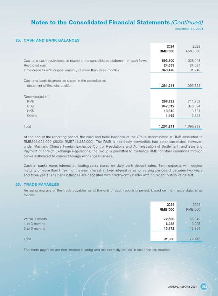 ANNUAL REPORT 2024 153 Notes to the Consolidated Financial Statements (Continued) December 31, 2024 25. CASH AND BANK BALANCES 2023 2024 RMB ’ 000 RMB ’ 000 1,038,048 893,100 24,537 24,633 31,248 343,478 1,093,833 1,261,211 711,252 298,922 376,534 947,012 3,724 13,812 2,323 1,465 1,093,833 1,261,211 Cash and cash equivalents as stated in the consolidated statement of cash flows Restricted cash Time deposits with original maturity of more than three months Cash and bank balances as stated in the consolidated statement of financial position Denominated in: RMB US$ HK$ Others Total At the end of the reporting period, the cash and bank balances of the Group denominated in RMB amounted to RMB 298 , 922 , 000 ( 2023 : RMB 711 , 252 , 000 ) . The RMB is not freely convertible into other currencies, however, under Mainland China ’ s Foreign Exchange Control Regulations and Administration of Settlement, and Sale and Payment of Foreign Exchange Regulations, the Group is permitted to exchange RMB for other currencies through banks authorized to conduct foreign exchange business . Cash at banks earns interest at floating rates based on daily bank deposit rates . Term deposits with original maturity of more than three months earn interest at fixed interest rates for varying periods of between two years and three years . The bank balances are deposited with creditworthy banks with no recent history of default . 26. TRADE PAYABLES An aging analysis of the trade payables as at the end of each reporting period, based on the invoice date, is as follows : 2023 2024 RMB ’ 000 RMB ’ 000 56,549 72,506 3,005 6,288 12,891 13,172 72,445 91,966 Within 1 month 1 to 3 months 3 to 6 months Total The trade payables are non - interest - bearing and are normally settled in less than six months.