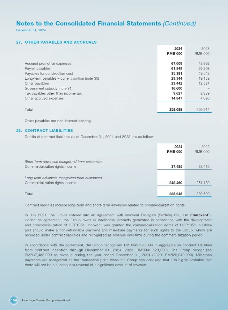 Ascentage Pharma Group International 154 Notes to the Consolidated Financial Statements (Continued) December 31, 2024 27. OTHER PAYABLES AND ACCRUALS 2023 2024 RMB ’ 000 RMB ’ 000 43,992 67,009 69,208 61,848 49,542 35,381 19,159 29,344 12,534 23,442 – 16,600 8,389 9,627 4,090 14,847 206,914 258,098 Accrued promotion expenses Payroll payables Payables for construction cost Long - term payables – current portion (note 30) Other payables Government subsidy (note 31) Tax payables other than income tax Other accrued expenses Total Other payables are non - interest - bearing. 28. CONTRACT LIABILITIES Details of contract liabilities as at December 31, 2024 and 2023 are as follows: 2023 2024 RMB ’ 000 RMB ’ 000 38,410 37,485 251,189 248,460 289,599 285,945 Short - term advances recognized from customers Commercialization rights income Long - term advances recognized from customers Commercialization rights income Total Contract liabilities include long - term and short - term advances related to commercialization rights. In July 2021 , the Group entered into an agreement with Innovent Biologics (Suzhou) Co . , Ltd ( “ Innovent ” ) . Under the agreement, the Group owns all intellectual property generated in connection with the development and commercialization of HQP 1351 . Innovent was granted the commercialization rights of HQP 1351 in China and should make a non - refundable payment and milestone payments for such rights to the Group, which are recorded under contract liabilities and recognized as revenue over time during the commercialization period . In accordance with the agreement, the Group recognized RMB 349 , 523 , 000 in aggregate as contract liabilities from contract inception through December 31 , 2024 ( 2023 : RMB 349 , 523 , 000 ) . The Group recognized RMB 37 , 485 , 000 as revenue during the year ended December 31 , 2024 ( 2023 : RMB 26 , 049 , 000 ) . Milestone payments are recognized as the transaction price when the Group can conclude that it is highly probable that there will not be a subsequent reversal of a significant amount of revenue .
