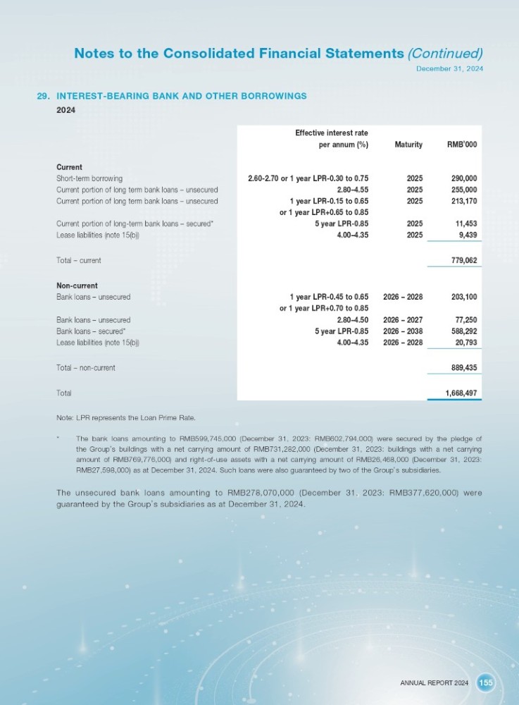 ANNUAL REPORT 2024 155 Notes to the Consolidated Financial Statements (Continued) December 31, 2024 29. INTEREST - BEARING BANK AND OTHER BORROWINGS 2024 Effective interest rate RMB ’ 000 Maturity per annum (%) 290,000 2025 2.60 - 2.70 or 1 year LPR - 0.30 to 0.75 255,000 2025 2.80 – 4.55 213,170 2025 1 year LPR - 0.15 to 0.65 or 1 year LPR+0.65 to 0.85 11,453 2025 5 year LPR - 0.85 9,439 2025 4.00 – 4.35 779,062 203,100 2026 – 2028 1 year LPR - 0.45 to 0.65 or 1 year LPR+0.70 to 0.85 77,250 2026 – 2027 2.80 – 4.50 588,292 2026 – 2038 5 year LPR - 0.85 20,793 2026 – 2028 4.00 – 4.35 889,435 1,668,497 Current Short - term borrowing Current portion of long term bank loans – unsecured Current portion of long term bank loans – unsecured Current portion of long - term bank loans – secured* Lease liabilities (note 15(b)) Total – current Non - current Bank loans – unsecured Bank loans – unsecured Bank loans – secured* Lease liabilities (note 15(b)) Total – non - current Total Note: LPR represents the Loan Prime Rate. * The bank loans amounting to RMB 599 , 745 , 000 (December 31 , 2023 : RMB 602 , 794 , 000 ) were secured by the pledge of the Group ’ s buildings with a net carrying amount of RMB 731 , 282 , 000 (December 31 , 2023 : buildings with a net carrying amount of RMB 769 , 776 , 000 ) and right - of - use assets with a net carrying amount of RMB 26 , 468 , 000 (December 31 , 2023 : RMB 27 , 598 , 000 ) as at December 31 , 2024 . Such loans were also guaranteed by two of the Group ’ s subsidiaries . The unsecured bank loans amounting to RMB278,070,000 (December 31, 2023: RMB377,620,000) were guaranteed by the Group ’ s subsidiaries as at December 31, 2024.
