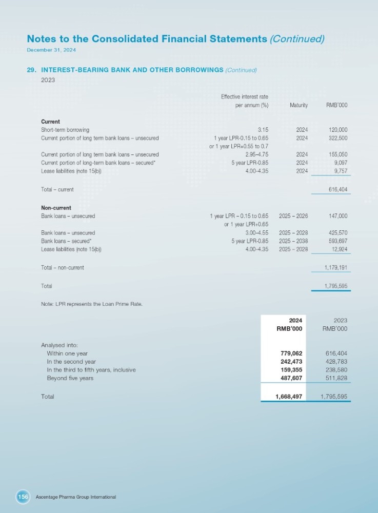 Ascentage Pharma Group International 156 Notes to the Consolidated Financial Statements (Continued) December 31, 2024 29. INTEREST - BEARING BANK AND OTHER BORROWINGS (Continued) 2023 Effective interest rate RMB ’ 000 Maturity per annum (%) 120,000 2024 3.15 Current Short - term borrowing 322,500 2024 1 year LPR - 0.15 to 0.65 Current portion of long term bank loans – unsecured 155,050 2024 or 1 year LPR+0.55 to 0.7 2.95 – 4.75 Current portion of long term bank loans – unsecured 9,097 2024 5 year LPR - 0.85 Current portion of long - term bank loans – secured* 9,757 2024 4.00 – 4.35 Lease liabilities (note 15(b)) 616,404 Total – current 147,000 2025 – 2026 1 year LPR – 0.15 to 0.65 Non - current Bank loans – unsecured 425,570 2025 – 2028 or 1 year LPR+0.65 3.00 – 4.55 Bank loans – unsecured 593,697 2025 – 2038 5 year LPR - 0.85 Bank loans – secured* 12,924 2025 – 2028 4.00 – 4.35 Lease liabilities (note 15(b)) 1,179,191 Total – non - current 1,795,595 Total Note: LPR represents the Loan Prime Rate. Analysed into: Within one year In the second year In the third to fifth years, inclusive Beyond five years Total 2023 2024 RMB ’ 000 RMB ’ 000 616,404 779,062 428,783 242,473 238,580 159,355 511,828 487,607 1,795,595 1,668,497