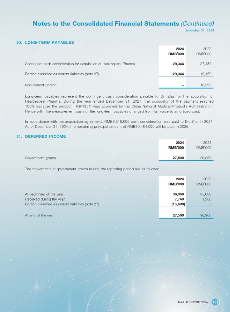 ANNUAL REPORT 2024 157 Notes to the Consolidated Financial Statements (Continued) December 31, 2024 30. LONG - TERM PAYABLES 2023 2024 RMB ’ 000 RMB ’ 000 37,458 29,344 19,159 29,344 18,299 – Contingent cash consideration for acquisition of Healthquest Pharma Portion classified as current liabilities (note 27) Non - current portion Long - term payables represent the contingent cash consideration payable to Dr . Zhai for the acquisition of Healthquest Pharma . During the year ended December 31 , 2021 , the possibility of the payment reached 100 % because the product (HQP 1351 ) was approved by the China National Medical Products Administration . Henceforth, the measurement basis of the long - term payables changed from fair value to amortized cost . In accordance with the acquisition agreement, RMB 9 , 516 , 000 cash consideration was paid to Dr . Zhai in 2024 . As of December 31 , 2024 , the remaining principal amount of RMB 30 , 484 , 000 will be paid in 2025 . 31. DEFERRED INCOME 2023 RMB ’ 000 Government grants 2024 RMB ’ 000 27,500 36,360 The movements in government grants during the reporting period are as follows: At beginning of the year Received during the year Portion classified as current liabilities (note 27) At end of the year 2023 2024 RMB ’ 000 RMB ’ 000 35,000 36,360 1,360 7,740 – (16,600) 36,360 27,500