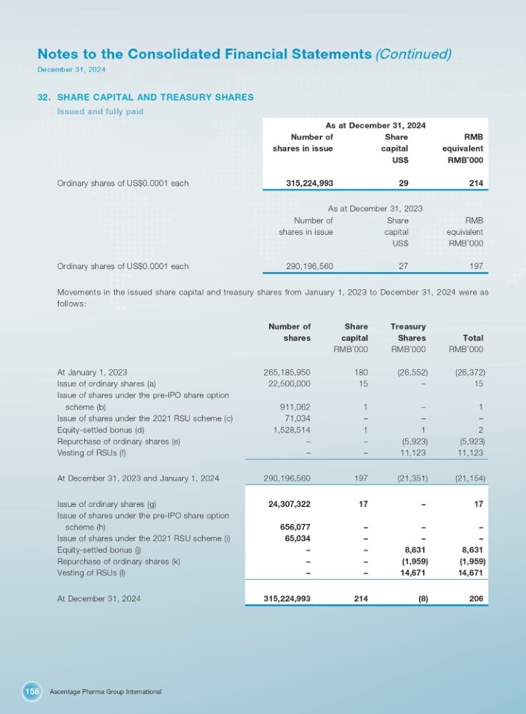 Ascentage Pharma Group International 158 Notes to the Consolidated Financial Statements (Continued) December 31, 2024 32. SHARE CAPITAL AND TREASURY SHARES Issued and fully paid As at December 31, 2024 RMB Share Number of equivalent RMB ’ 000 capital US$ shares in issue 214 29 Ordinary shares of US$0.0001 each 315,224,993 As at December 31, 2023 RMB Share Number of equivalent RMB ’ 000 capital US$ shares in issue 197 27 290,196,560 Ordinary shares of US$0.0001 each Movements in the issued share capital and treasury shares from January 1, 2023 to December 31, 2024 were as follows: Total Treasury Shares Share capital Number of shares RMB ’ 000 RMB ’ 000 RMB ’ 000 (26,372) (26,552) 180 265,185,950 At January 1, 2023 15 – 15 22,500,000 Issue of ordinary shares (a) Issue of shares under the pre - IPO share option 1 – 1 911,062 scheme (b) – – – 71,034 Issue of shares under the 2021 RSU scheme (c) 2 1 1 1,528,514 Equity - settled bonus (d) (5,923) (5,923) – – Repurchase of ordinary shares (e) 11,123 11,123 – – Vesting of RSUs (f) (21,154) (21,351) 197 290,196,560 At December 31, 2023 and January 1, 2024 17 – 17 24,307,322 Issue of ordinary shares (g) Issue of shares under the pre - IPO share option – – – 656,077 scheme (h) – – – 65,034 Issue of shares under the 2021 RSU scheme (i) 8,631 8,631 – – Equity - settled bonus (j) (1,959) (1,959) – – Repurchase of ordinary shares (k) 14,671 14,671 – – Vesting of RSUs (l) 206 (8) 214 315,224,993 At December 31, 2024