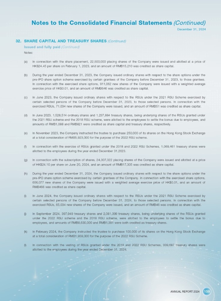 ANNUAL REPORT 2024 159 Notes to the Consolidated Financial Statements (Continued) December 31, 2024 32. SHARE CAPITAL AND TREASURY SHARES (Continued) Issued and fully paid (Continued) Notes: (a) In connection with the share placement, 22 , 500 , 000 placing shares of the Company were issued and allotted at a price of HK $ 24 . 45 per share on February 1 , 2023 , and an amount of RMB 15 , 210 was credited as share capital . (b) During the year ended December 31 , 2023 , the Company issued ordinary shares with respect to the share options under the pre - IPO share option scheme exercised by certain grantees of the Company before December 31 , 2023 , to those grantees . In connection with the exercised share options, 911 , 062 new shares of the Company were issued with a weighted average exercise price of HK $ 0 . 01 , and an amount of RMB 646 was credited as share capital . (c) In June 2023 , the Company issued ordinary shares with respect to the RSUs under the 2021 RSU Scheme exercised by certain selected persons of the Company before December 31 , 2023 , to those selected persons . In connection with the exercised RSUs, 71 , 034 new shares of the Company were issued, and an amount of RMB 51 was credited as share capital . (d) In June 2023 , 1 , 528 , 514 ordinary shares and 1 , 237 , 884 treasury shares, being underlying shares of the RSUs granted under the 2021 RSU scheme and the 2018 RSU scheme, were allotted to the employees to settle the bonus due to employees, and amounts of RMB 1 , 088 and RMB 821 were credited as share capital and treasury shares, respectively . (e) In November 2023 , the Company instructed the trustee to purchase 250 , 000 of its shares on the Hong Kong Stock Exchange at a total consideration of RMB 5 , 923 , 000 for the purpose of the 2022 RSU scheme . (f) In connection with the exercise of RSUs granted under the 2018 and 2022 RSU Schemes, 1 , 069 , 461 treasury shares were allotted to the employees during the year ended December 31 , 2023 . (g) In connection with the subscription of shares, 24 , 307 , 322 placing shares of the Company were issued and allotted at a price of HK $ 24 . 10 per share on June 20 , 2024 , and an amount of RMB 17 , 305 was credited as share capital . (h) During the year ended December 31 , 2024 , the Company issued ordinary shares with respect to the share options under the pre - IPO share option scheme exercised by certain grantees of the Company . In connection with the exercised share options, 656 , 077 new shares of the Company were issued with a weighted average exercise price of HK $ 0 . 01 , and an amount of RMB 466 was credited as share capital . (i) In June 2024 , the Company issued ordinary shares with respect to the RSUs under the 2021 RSU Scheme exercised by certain selected persons of the Company before December 31 , 2024 , to those selected persons . In connection with the exercised RSUs, 65 , 034 new shares of the Company were issued, and an amount of RMB 46 was credited as share capital . (j) In September 2024 , 397 , 949 treasury shares and 2 , 081 , 399 treasury shares, being underlying shares of the RSUs granted under the 2022 RSU scheme and the 2018 RSU scheme, were allotted to the employees to settle the bonus due to employees, and amounts of RMB 8 , 630 , 000 and RMB 1 , 381 were both credited as treasury shares . (k) In February 2024 , the Company instructed the trustee to purchase 100 , 000 of its shares on the Hong Kong Stock Exchange at a total consideration of RMB 1 , 959 , 000 for the purpose of the 2022 RSU Scheme . (l) In connection with the vesting of RSUs granted under the 2018 and 2022 RSU Schemes, 939 , 687 treasury shares were allotted to the employees during the year ended December 31 , 2024 .