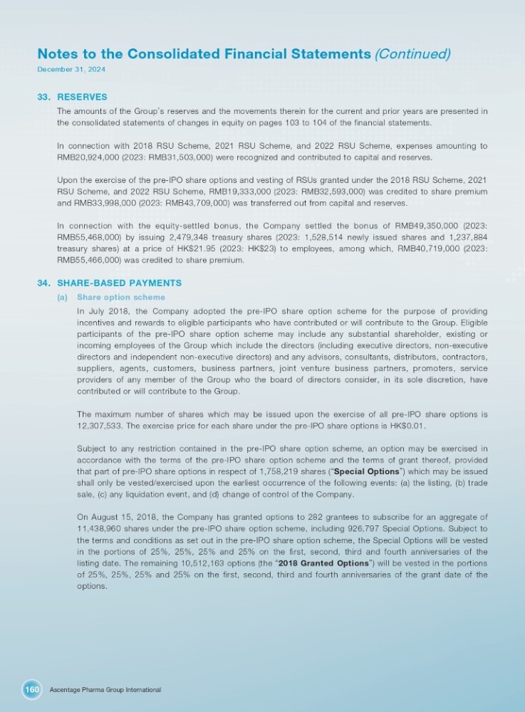 Ascentage Pharma Group International 160 Notes to the Consolidated Financial Statements (Continued) December 31, 2024 33. RESERVES The amounts of the Group ’ s reserves and the movements therein for the current and prior years are presented in the consolidated statements of changes in equity on pages 103 to 104 of the financial statements . In connection with 2018 RSU Scheme, 2021 RSU Scheme, and 2022 RSU Scheme, expenses amounting to RMB 20 , 924 , 000 ( 2023 : RMB 31 , 503 , 000 ) were recognized and contributed to capital and reserves . Upon the exercise of the pre - IPO share options and vesting of RSUs granted under the 2018 RSU Scheme, 2021 RSU Scheme, and 2022 RSU Scheme, RMB 19 , 333 , 000 ( 2023 : RMB 32 , 593 , 000 ) was credited to share premium and RMB 33 , 998 , 000 ( 2023 : RMB 43 , 709 , 000 ) was transferred out from capital and reserves . In connection with the equity - settled bonus, the Company settled the bonus of RMB 49 , 350 , 000 ( 2023 : RMB 55 , 468 , 000 ) by issuing 2 , 479 , 348 treasury shares ( 2023 : 1 , 528 , 514 newly issued shares and 1 , 237 , 884 treasury shares) at a price of HK $ 21 . 95 ( 2023 : HK $ 23 ) to employees, among which, RMB 40 , 719 , 000 ( 2023 : RMB 55 , 466 , 000 ) was credited to share premium . 34. SHARE - BASED PAYMENTS (a) Share option scheme In July 2018 , the Company adopted the pre - IPO share option scheme for the purpose of providing incentives and rewards to eligible participants who have contributed or will contribute to the Group . Eligible participants of the pre - IPO share option scheme may include any substantial shareholder, existing or incoming employees of the Group which include the directors (including executive directors, non - executive directors and independent non - executive directors) and any advisors, consultants, distributors, contractors, suppliers, agents, customers, business partners, joint venture business partners, promoters, service providers of any member of the Group who the board of directors consider, in its sole discretion, have contributed or will contribute to the Group . The maximum number of shares which may be issued upon the exercise of all pre - IPO share options is 12 , 307 , 533 . The exercise price for each share under the pre - IPO share options is HK $ 0 . 01 . Subject to any restriction contained in the pre - IPO share option scheme, an option may be exercised in accordance with the terms of the pre - IPO share option scheme and the terms of grant thereof, provided that part of pre - IPO share options in respect of 1 , 758 , 219 shares ( “ Special Options ” ) which may be issued shall only be vested/exercised upon the earliest occurrence of the following events : (a) the listing, (b) trade sale, (c) any liquidation event, and (d) change of control of the Company . On August 15 , 2018 , the Company has granted options to 282 grantees to subscribe for an aggregate of 11 , 438 , 960 shares under the pre - IPO share option scheme, including 926 , 797 Special Options . Subject to the terms and conditions as set out in the pre - IPO share option scheme, the Special Options will be vested in the portions of 25 % , 25 % , 25 % and 25 % on the first, second, third and fourth anniversaries of the listing date . The remaining 10 , 512 , 163 options (the “ 2018 Granted Options ” ) will be vested in the portions of 25 % , 25 % , 25 % and 25 % on the first, second, third and fourth anniversaries of the grant date of the options .