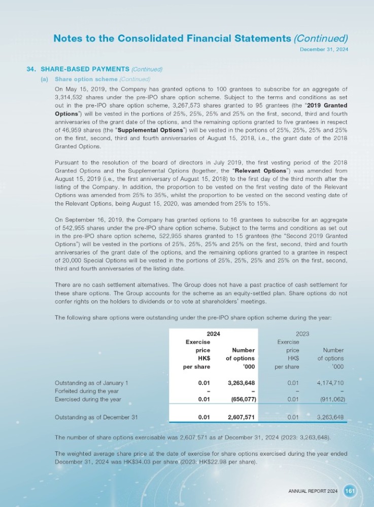 ANNUAL REPORT 2024 161 Notes to the Consolidated Financial Statements (Continued) December 31, 2024 34. SHARE - BASED PAYMENTS (Continued) (a) Share option scheme (Continued) On May 15 , 2019 , the Company has granted options to 100 grantees to subscribe for an aggregate of 3 , 314 , 532 shares under the pre - IPO share option scheme . Subject to the terms and conditions as set out in the pre - IPO share option scheme, 3 , 267 , 573 shares granted to 95 grantees (the “ 2019 Granted Options ” ) will be vested in the portions of 25 % , 25 % , 25 % and 25 % on the first, second, third and fourth anniversaries of the grant date of the options, and the remaining options granted to five grantees in respect of 46 , 959 shares (the “ Supplemental Options ” ) will be vested in the portions of 25 % , 25 % , 25 % and 25 % on the first, second, third and fourth anniversaries of August 15 , 2018 , i . e . , the grant date of the 2018 Granted Options . Pursuant to the resolution of the board of directors in July 2019 , the first vesting period of the 2018 Granted Options and the Supplemental Options (together, the “ Relevant Options ” ) was amended from August 15 , 2019 (i . e . , the first anniversary of August 15 , 2018 ) to the first day of the third month after the listing of the Company . In addition, the proportion to be vested on the first vesting date of the Relevant Options was amended from 25 % to 35 % , whilst the proportion to be vested on the second vesting date of the Relevant Options, being August 15 , 2020 , was amended from 25 % to 15 % . On September 16 , 2019 , the Company has granted options to 16 grantees to subscribe for an aggregate of 542 , 955 shares under the pre - IPO share option scheme . Subject to the terms and conditions as set out in the pre - IPO share option scheme, 522 , 955 shares granted to 15 grantees (the “ Second 2019 Granted Options ” ) will be vested in the portions of 25 % , 25 % , 25 % and 25 % on the first, second, third and fourth anniversaries of the grant date of the options, and the remaining options granted to a grantee in respect of 20 , 000 Special Options will be vested in the portions of 25 % , 25 % , 25 % and 25 % on the first, second, third and fourth anniversaries of the listing date . There are no cash settlement alternatives . The Group does not have a past practice of cash settlement for these share options . The Group accounts for the scheme as an equity - settled plan . Share options do not confer rights on the holders to dividends or to vote at shareholders ’ meetings . The following share options were outstanding under the pre - IPO share option scheme during the year : 2023 2024 Exercise Exercise Number price Number price of options HK$ of options HK$ ’ 000 per share ’ 000 per share 4,174,710 0.01 3,263,648 0.01 – – – – (911,062) 0.01 (656,077) 0.01 3,263,648 0.01 2,607,571 0.01 Outstanding as of January 1 Forfeited during the year Exercised during the year Outstanding as of December 31 The number of share options exercisable was 2,607,571 as at December 31, 2024 (2023: 3,263,648). The weighted average share price at the date of exercise for share options exercised during the year ended December 31, 2024 was HK$34.03 per share (2023: HK$22.98 per share).