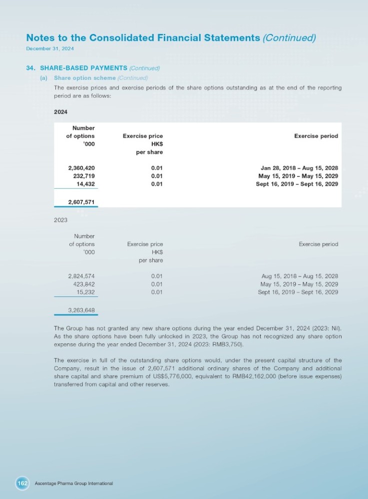 Ascentage Pharma Group International 162 Notes to the Consolidated Financial Statements (Continued) December 31, 2024 34. SHARE - BASED PAYMENTS (Continued) (a) Share option scheme (Continued) The exercise prices and exercise periods of the share options outstanding as at the end of the reporting period are as follows: 2024 Number Exercise period Exercise price of options HK$ ’ 000 per share Jan 28, 2018 – Aug 15, 2028 0.01 2,360,420 May 15, 2019 – May 15, 2029 0.01 232,719 Sept 16, 2019 – Sept 16, 2029 0.01 14,432 2,607,571 2023 Number Exercise period Exercise price HK$ of options ’ 000 per share Aug 15, 2018 – Aug 15, 2028 0.01 2,824,574 May 15, 2019 – May 15, 2029 0.01 423,842 Sept 16, 2019 – Sept 16, 2029 0.01 15,232 3,263,648 The Group has not granted any new share options during the year ended December 31 , 2024 ( 2023 : Nil) . As the share options have been fully unlocked in 2023 , the Group has not recognized any share option expense during the year ended December 31 , 2024 ( 2023 : RMB 3 , 750 ) . The exercise in full of the outstanding share options would, under the present capital structure of the Company, result in the issue of 2 , 607 , 571 additional ordinary shares of the Company and additional share capital and share premium of US $ 5 , 776 , 000 , equivalent to RMB 42 , 162 , 000 (before issue expenses) transferred from capital and other reserves .