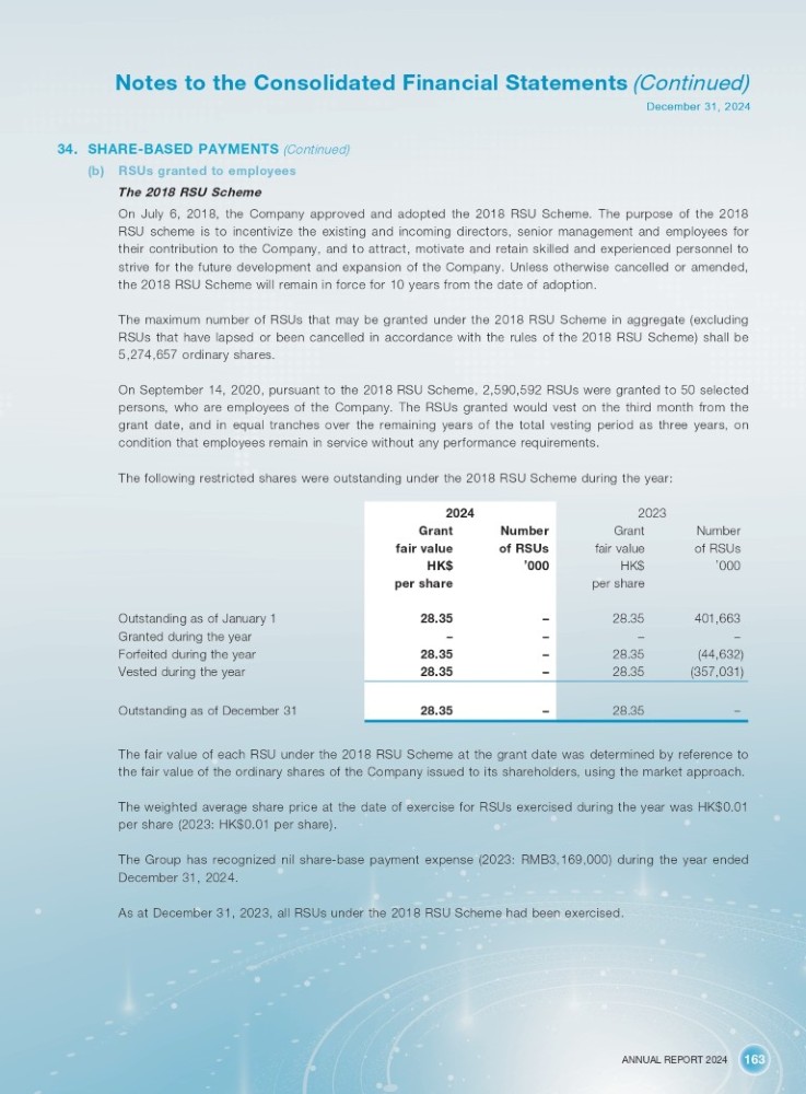 ANNUAL REPORT 2024 163 Notes to the Consolidated Financial Statements (Continued) December 31, 2024 34. SHARE - BASED PAYMENTS (Continued) (b) RSUs granted to employees The 2018 RSU Scheme On July 6 , 2018 , the Company approved and adopted the 2018 RSU Scheme . The purpose of the 2018 RSU scheme is to incentivize the existing and incoming directors, senior management and employees for their contribution to the Company, and to attract, motivate and retain skilled and experienced personnel to strive for the future development and expansion of the Company . Unless otherwise cancelled or amended, the 2018 RSU Scheme will remain in force for 10 years from the date of adoption . The maximum number of RSUs that may be granted under the 2018 RSU Scheme in aggregate (excluding RSUs that have lapsed or been cancelled in accordance with the rules of the 2018 RSU Scheme) shall be 5 , 274 , 657 ordinary shares . On September 14 , 2020 , pursuant to the 2018 RSU Scheme, 2 , 590 , 592 RSUs were granted to 50 selected persons, who are employees of the Company . The RSUs granted would vest on the third month from the grant date, and in equal tranches over the remaining years of the total vesting period as three years, on condition that employees remain in service without any performance requirements . The following restricted shares were outstanding under the 2018 RSU Scheme during the year : 2023 2024 Number Grant Grant Number of RSUs fair value fair value of RSUs ’ 000 HK$ HK$ ’ 000 per share per share 401,663 28.35 28.35 – – – – – (44,632) 28.35 28.35 – (357,031) 28.35 28.35 – 28.35 – 28.35 – Outstanding as of January 1 Granted during the year Forfeited during the year Vested during the year Outstanding as of December 31 The fair value of each RSU under the 2018 RSU Scheme at the grant date was determined by reference to the fair value of the ordinary shares of the Company issued to its shareholders, using the market approach. The weighted average share price at the date of exercise for RSUs exercised during the year was HK$0.01 per share (2023: HK$0.01 per share). The Group has recognized nil share - base payment expense (2023: RMB3,169,000) during the year ended December 31, 2024. As at December 31, 2023, all RSUs under the 2018 RSU Scheme had been exercised.