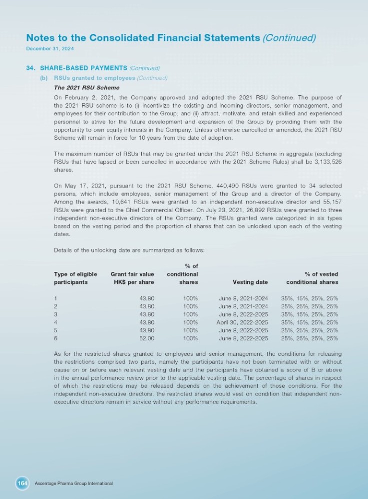 Ascentage Pharma Group International 164 Notes to the Consolidated Financial Statements (Continued) December 31, 2024 34. SHARE - BASED PAYMENTS (Continued) (b) RSUs granted to employees (Continued) The 2021 RSU Scheme On February 2 , 2021 , the Company approved and adopted the 2021 RSU Scheme . The purpose of the 2021 RSU scheme is to (i) incentivize the existing and incoming directors, senior management, and employees for their contribution to the Group ; and (ii) attract, motivate, and retain skilled and experienced personnel to strive for the future development and expansion of the Group by providing them with the opportunity to own equity interests in the Company . Unless otherwise cancelled or amended, the 2021 RSU Scheme will remain in force for 10 years from the date of adoption . The maximum number of RSUs that may be granted under the 2021 RSU Scheme in aggregate (excluding RSUs that have lapsed or been cancelled in accordance with the 2021 Scheme Rules) shall be 3 , 133 , 526 shares . On May 17 , 2021 , pursuant to the 2021 RSU Scheme, 440 , 490 RSUs were granted to 34 selected persons, which include employees, senior management of the Group and a director of the Company . Among the awards, 10 , 641 RSUs were granted to an independent non - executive director and 55 , 157 RSUs were granted to the Chief Commercial Officer . On July 23 , 2021 , 26 , 892 RSUs were granted to three independent non - executive directors of the Company . The RSUs granted were categorized in six types based on the vesting period and the proportion of shares that can be unlocked upon each of the vesting dates . Details of the unlocking date are summarized as follows : % of vested conditional shares Vesting date % of conditional shares Grant fair value HK$ per share Type of eligible participants 35%, 15%, 25%, 25% June 8, 2021 - 2024 100% 43.80 1 25%, 25%, 25%, 25% June 8, 2021 - 2024 100% 43.80 2 35%, 15%, 25%, 25% June 8, 2022 - 2025 100% 43.80 3 35%, 15%, 25%, 25% April 30, 2022 - 2025 100% 43.80 4 25%, 25%, 25%, 25% June 8, 2022 - 2025 100% 43.80 5 25%, 25%, 25%, 25% June 8, 2022 - 2025 100% 52.00 6 As for the restricted shares granted to employees and senior management, the conditions for releasing the restrictions comprised two parts, namely the participants have not been terminated with or without cause on or before each relevant vesting date and the participants have obtained a score of B or above in the annual performance review prior to the applicable vesting date . The percentage of shares in respect of which the restrictions may be released depends on the achievement of those conditions . For the independent non - executive directors, the restricted shares would vest on condition that independent non - executive directors remain in service without any performance requirements .