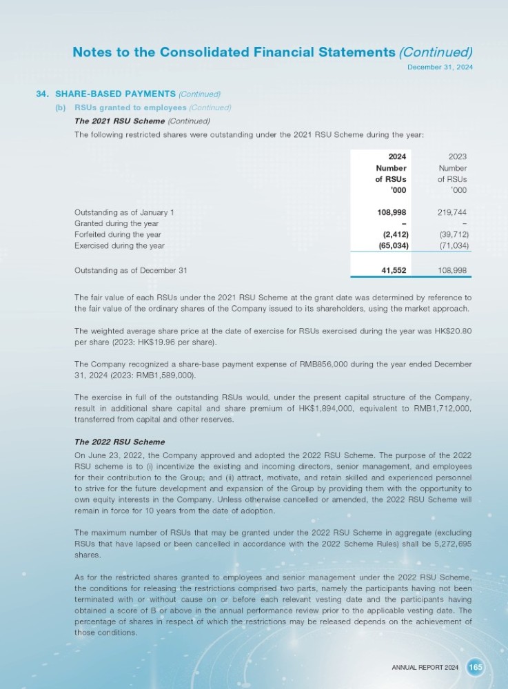 ANNUAL REPORT 2024 165 Notes to the Consolidated Financial Statements (Continued) December 31, 2024 34. SHARE - BASED PAYMENTS (Continued) (b) RSUs granted to employees (Continued) The 2021 RSU Scheme (Continued) The following restricted shares were outstanding under the 2021 RSU Scheme during the year: 2023 2024 Number Number of RSUs of RSUs ’ 000 ’ 000 219,744 108,998 – – (39,712) (2,412) (71,034) (65,034) 108,998 41,552 Outstanding as of January 1 Granted during the year Forfeited during the year Exercised during the year Outstanding as of December 31 The fair value of each RSUs under the 2021 RSU Scheme at the grant date was determined by reference to the fair value of the ordinary shares of the Company issued to its shareholders, using the market approach. The weighted average share price at the date of exercise for RSUs exercised during the year was HK$20.80 per share (2023: HK$19.96 per share). The Company recognized a share - base payment expense of RMB856,000 during the year ended December 31, 2024 (2023: RMB1,589,000). The exercise in full of the outstanding RSUs would, under the present capital structure of the Company, result in additional share capital and share premium of HK $ 1 , 894 , 000 , equivalent to RMB 1 , 712 , 000 , transferred from capital and other reserves . The 2022 RSU Scheme On June 23 , 2022 , the Company approved and adopted the 2022 RSU Scheme . The purpose of the 2022 RSU scheme is to (i) incentivize the existing and incoming directors, senior management, and employees for their contribution to the Group ; and (ii) attract, motivate, and retain skilled and experienced personnel to strive for the future development and expansion of the Group by providing them with the opportunity to own equity interests in the Company . Unless otherwise cancelled or amended, the 2022 RSU Scheme will remain in force for 10 years from the date of adoption . The maximum number of RSUs that may be granted under the 2022 RSU Scheme in aggregate (excluding RSUs that have lapsed or been cancelled in accordance with the 2022 Scheme Rules) shall be 5 , 272 , 695 shares . As for the restricted shares granted to employees and senior management under the 2022 RSU Scheme, the conditions for releasing the restrictions comprised two parts, namely the participants having not been terminated with or without cause on or before each relevant vesting date and the participants having obtained a score of B or above in the annual performance review prior to the applicable vesting date . The percentage of shares in respect of which the restrictions may be released depends on the achievement of those conditions .