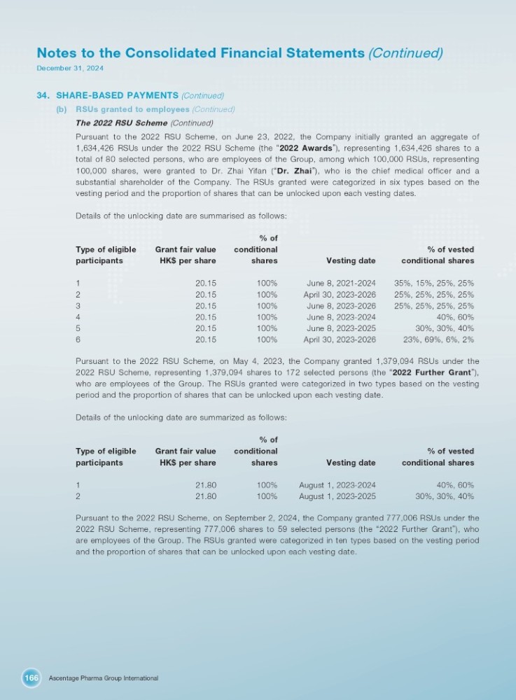 Ascentage Pharma Group International 166 Notes to the Consolidated Financial Statements (Continued) December 31, 2024 34. SHARE - BASED PAYMENTS (Continued) (b) RSUs granted to employees (Continued) The 2022 RSU Scheme (Continued) Pursuant to the 2022 RSU Scheme, on June 23 , 2022 , the Company initially granted an aggregate of 1 , 634 , 426 RSUs under the 2022 RSU Scheme (the “ 2022 Awards ” ), representing 1 , 634 , 426 shares to a total of 80 selected persons, who are employees of the Group, among which 100 , 000 RSUs, representing 100 , 000 shares, were granted to Dr . Zhai Yifan ( “ Dr . Zhai ” ), who is the chief medical officer and a substantial shareholder of the Company . The RSUs granted were categorized in six types based on the vesting period and the proportion of shares that can be unlocked upon each vesting dates . Details of the unlocking date are summarised as follows : % of vested conditional shares Vesting date % of conditional shares Grant fair value HK$ per share Type of eligible participants 35%, 15%, 25%, 25% June 8, 2021 - 2024 100% 20.15 1 25%, 25%, 25%, 25% April 30, 2023 - 2026 100% 20.15 2 25%, 25%, 25%, 25% June 8, 2023 - 2026 100% 20.15 3 40%, 60% June 8, 2023 - 2024 100% 20.15 4 30%, 30%, 40% June 8, 2023 - 2025 100% 20.15 5 23%, 69%, 6%, 2% April 30, 2023 - 2026 100% 20.15 6 Pursuant to the 2022 RSU Scheme, on May 4 , 2023 , the Company granted 1 , 379 , 094 RSUs under the 2022 RSU Scheme, representing 1 , 379 , 094 shares to 172 selected persons (the “ 2022 Further Grant ” ), who are employees of the Group . The RSUs granted were categorized in two types based on the vesting period and the proportion of shares that can be unlocked upon each vesting date . Details of the unlocking date are summarized as follows : % of vested conditional shares Vesting date % of conditional shares Grant fair value HK$ per share Type of eligible participants 40%, 60% August 1, 2023 - 2024 100% 21.80 1 30%, 30%, 40% August 1, 2023 - 2025 100% 21.80 2 Pursuant to the 2022 RSU Scheme, on September 2 , 2024 , the Company granted 777 , 006 RSUs under the 2022 RSU Scheme, representing 777 , 006 shares to 59 selected persons (the “ 2022 Further Grant ” ), who are employees of the Group . The RSUs granted were categorized in ten types based on the vesting period and the proportion of shares that can be unlocked upon each vesting date .