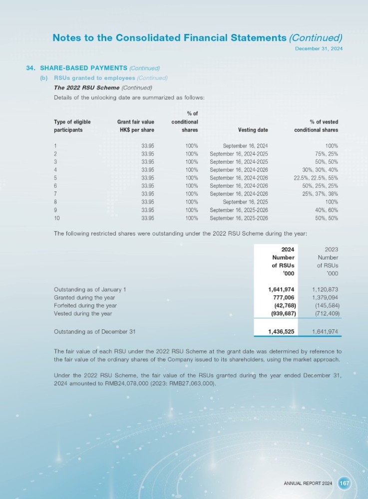 ANNUAL REPORT 2024 167 Notes to the Consolidated Financial Statements (Continued) December 31, 2024 34. SHARE - BASED PAYMENTS (Continued) (b) RSUs granted to employees (Continued) The 2022 RSU Scheme (Continued) Details of the unlocking date are summarized as follows: % of vested conditional shares Vesting date % of conditional shares Grant fair value HK$ per share Type of eligible participants 100% September 16, 2024 100% 33.95 1 75%, 25% September 16, 2024 - 2025 100% 33.95 2 50%, 50% September 16, 2024 - 2025 100% 33.95 3 30%, 30%, 40% September 16, 2024 - 2026 100% 33.95 4 22.5%, 22.5%, 55% September 16, 2024 - 2026 100% 33.95 5 50%, 25%, 25% September 16, 2024 - 2026 100% 33.95 6 25%, 37%, 38% September 16, 2024 - 2026 100% 33.95 7 100% September 16, 2025 100% 33.95 8 40%, 60% September 16, 2025 - 2026 100% 33.95 9 50%, 50% September 16, 2025 - 2026 100% 33.95 10 The following restricted shares were outstanding under the 2022 RSU Scheme during the year: 2023 2024 Number Number of RSUs of RSUs ’ 000 ’ 000 1,120,873 1,641,974 1,379,094 777,006 (145,584) (42,768) (712,409) (939,687) 1,641,974 1,436,525 Outstanding as of January 1 Granted during the year Forfeited during the year Vested during the year Outstanding as of December 31 The fair value of each RSU under the 2022 RSU Scheme at the grant date was determined by reference to the fair value of the ordinary shares of the Company issued to its shareholders, using the market approach. Under the 2022 RSU Scheme, the fair value of the RSUs granted during the year ended December 31, 2024 amounted to RMB24,078,000 (2023: RMB27,063,000).