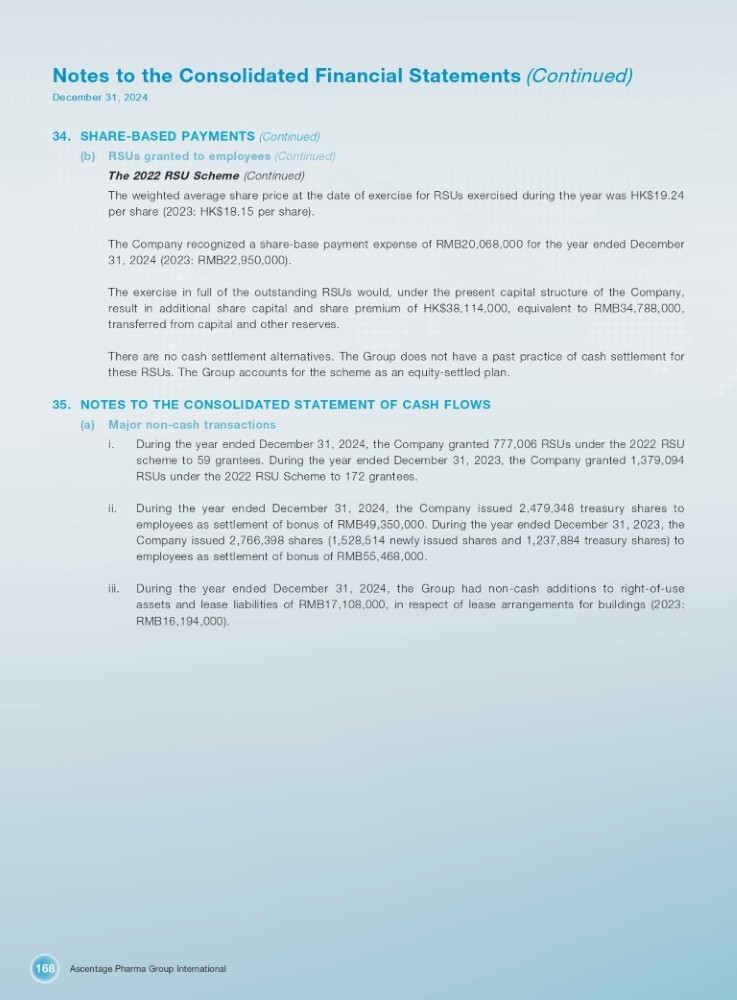Ascentage Pharma Group International 168 Notes to the Consolidated Financial Statements (Continued) December 31, 2024 34. SHARE - BASED PAYMENTS (Continued) (b) RSUs granted to employees (Continued) The 2022 RSU Scheme (Continued) The weighted average share price at the date of exercise for RSUs exercised during the year was HK $ 19 . 24 per share ( 2023 : HK $ 18 . 15 per share) . The Company recognized a share - base payment expense of RMB 20 , 068 , 000 for the year ended December 31 , 2024 ( 2023 : RMB 22 , 950 , 000 ) . The exercise in full of the outstanding RSUs would, under the present capital structure of the Company, result in additional share capital and share premium of HK $ 38 , 114 , 000 , equivalent to RMB 34 , 788 , 000 , transferred from capital and other reserves . There are no cash settlement alternatives . The Group does not have a past practice of cash settlement for these RSUs . The Group accounts for the scheme as an equity - settled plan . 35. NOTES TO THE CONSOLIDATED STATEMENT OF CASH FLOWS (a) Major non - cash transactions i. During the year ended December 31 , 2024 , the Company granted 777 , 006 RSUs under the 2022 RSU scheme to 59 grantees . During the year ended December 31 , 2023 , the Company granted 1 , 379 , 094 RSUs under the 2022 RSU Scheme to 172 grantees . ii. During the year ended December 31 , 2024 , the Company issued 2 , 479 , 348 treasury shares to employees as settlement of bonus of RMB 49 , 350 , 000 . During the year ended December 31 , 2023 , the Company issued 2 , 766 , 398 shares ( 1 , 528 , 514 newly issued shares and 1 , 237 , 884 treasury shares) to employees as settlement of bonus of RMB 55 , 468 , 000 . iii. During the year ended December 31 , 2024 , the Group had non - cash additions to right - of - use assets and lease liabilities of RMB 17 , 108 , 000 , in respect of lease arrangements for buildings ( 2023 : RMB 16 , 194 , 000 ) .