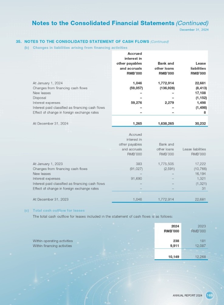ANNUAL REPORT 2024 169 Notes to the Consolidated Financial Statements (Continued) December 31, 2024 35. NOTES TO THE CONSOLIDATED STATEMENT OF CASH FLOWS (Continued) (b) Changes in liabilities arising from financing activities Accrued interest in Lease Bank and other payables liabilities other loans and accruals RMB ’ 000 RMB ’ 000 RMB ’ 000 22,681 1,772,914 1,046 At January 1, 2024 (8,413) (136,928) (59,057) Changes from financing cash flows 17,108 – – New leases (1,152) – – Disposal 1,498 2,279 59,276 Interest expenses (1,498) – – Interest paid classified as financing cash flows 8 – – Effect of change in foreign exchange rates 30,232 1,638,265 1,265 At December 31, 2024 Accrued interest in Bank and other payables Lease liabilities RMB ’ 000 other loans RMB ’ 000 and accruals RMB ’ 000 17,222 1,775,505 383 At January 1, 2023 (10,766) (2,591) (91,027) Changes from financing cash flows 16,194 – – New leases 1,321 – 91,690 Interest expenses (1,321) – – Interest paid classified as financing cash flows 31 – – Effect of change in foreign exchange rates 22,681 1,772,914 1,046 At December 31, 2023 (c) Total cash outflow for leases The total cash outflow for leases included in the statement of cash flows is as follows: Within operating activities Within financing activities 2023 2024 RMB ’ 000 RMB ’ 000 181 238 12,087 9,911 12,268 10,149