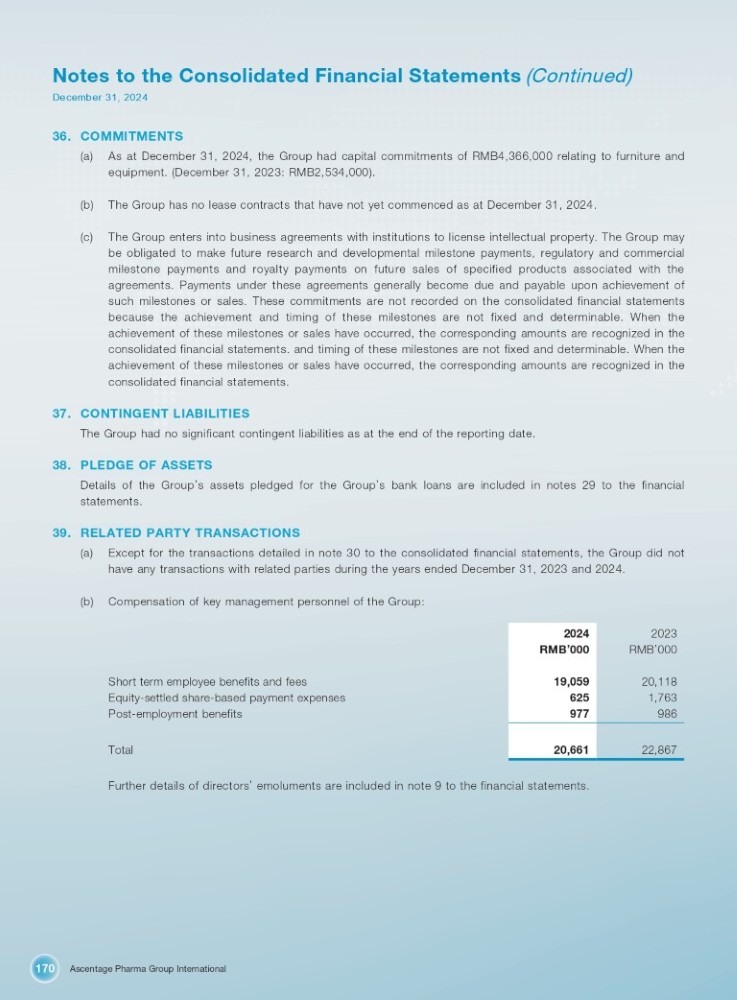 Ascentage Pharma Group International 170 Notes to the Consolidated Financial Statements (Continued) December 31, 2024 36. COMMITMENTS (a) As at December 31 , 2024 , the Group had capital commitments of RMB 4 , 366 , 000 relating to furniture and equipment . (December 31 , 2023 : RMB 2 , 534 , 000 ) . (b) The Group has no lease contracts that have not yet commenced as at December 31, 2024. (c) The Group enters into business agreements with institutions to license intellectual property . The Group may be obligated to make future research and developmental milestone payments, regulatory and commercial milestone payments and royalty payments on future sales of specified products associated with the agreements . Payments under these agreements generally become due and payable upon achievement of such milestones or sales . These commitments are not recorded on the consolidated financial statements because the achievement and timing of these milestones are not fixed and determinable . When the achievement of these milestones or sales have occurred, the corresponding amounts are recognized in the consolidated financial statements . and timing of these milestones are not fixed and determinable . When the achievement of these milestones or sales have occurred, the corresponding amounts are recognized in the consolidated financial statements . 37. CONTINGENT LIABILITIES The Group had no significant contingent liabilities as at the end of the reporting date. 38. PLEDGE OF ASSETS Details of the Group ’ s assets pledged for the Group ’ s bank loans are included in notes 29 to the financial statements. 39. RELATED PARTY TRANSACTIONS (a) Except for the transactions detailed in note 30 to the consolidated financial statements, the Group did not have any transactions with related parties during the years ended December 31 , 2023 and 2024 . (b) Compensation of key management personnel of the Group: 2023 2024 RMB ’ 000 RMB ’ 000 20,118 19,059 1,763 625 986 977 22,867 20,661 Short term employee benefits and fees Equity - settled share - based payment expenses Post - employment benefits Total Further details of directors ’ emoluments are included in note 9 to the financial statements.