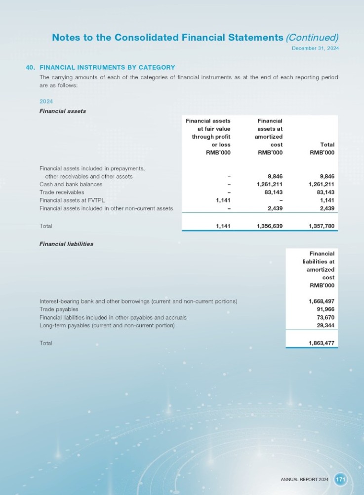 ANNUAL REPORT 2024 171 Notes to the Consolidated Financial Statements (Continued) December 31, 2024 40. FINANCIAL INSTRUMENTS BY CATEGORY The carrying amounts of each of the categories of financial instruments as at the end of each reporting period are as follows: 2024 Financial assets Financial Financial assets assets at at fair value amortized through profit Total cost or loss RMB ’ 000 RMB ’ 000 RMB ’ 000 9,846 9,846 – 1,261,211 1,261,211 – 83,143 83,143 – 1,141 – 1,141 2,439 2,439 – 1,357,780 1,356,639 1,141 Financial assets included in prepayments, other receivables and other assets Cash and bank balances Trade receivables Financial assets at FVTPL Financial assets included in other non - current assets Total Financial liabilities Interest - bearing bank and other borrowings (current and non - current portions) Trade payables Financial liabilities included in other payables and accruals Long - term payables (current and non - current portion) Financial liabilities at amortized cost RMB ’ 000 1,668,497 91,966 73,670 29,344 Total 1,863,477