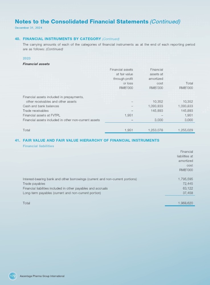 Ascentage Pharma Group International 172 Notes to the Consolidated Financial Statements (Continued) December 31, 2024 40. FINANCIAL INSTRUMENTS BY CATEGORY (Continued) The carrying amounts of each of the categories of financial instruments as at the end of each reporting period are as follows: (Continued) 2023 Financial assets Financial Financial assets assets at at fair value amortized through profit Total RMB ’ 000 cost RMB ’ 000 or loss RMB ’ 000 Financial assets included in prepayments, 10,352 10,352 – other receivables and other assets 1,093,833 1,093,833 – Cash and bank balances 145,893 145,893 – Trade receivables 1,951 – 1,951 Financial assets at FVTPL 3,000 3,000 – Financial assets included in other non - current assets 1,255,029 1,253,078 1,951 Total 41. FAIR VALUE AND FAIR VALUE HIERARCHY OF FINANCIAL INSTRUMENTS Financial liabilities Financial liabilities at amortized cost RMB ’ 000 Interest - bearing bank and other borrowings (current and non - current portions) Trade payables Financial liabilities included in other payables and accruals Long - term payables (current and non - current portion) 1,795,595 72,445 63,122 37,458 Total 1,968,620