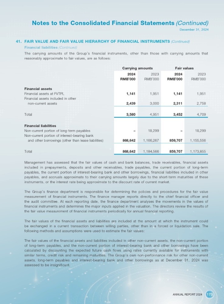 ANNUAL REPORT 2024 173 Notes to the Consolidated Financial Statements (Continued) December 31, 2024 41. FAIR VALUE AND FAIR VALUE HIERARCHY OF FINANCIAL INSTRUMENTS (Continued) Financial liabilities (Continued) The carrying amounts of the Group ’ s financial instruments, other than those with carrying amounts that reasonably approximate to fair values, are as follows: Carrying amounts Fair values 2023 2024 2023 2024 RMB ’ 000 RMB ’ 000 RMB ’ 000 RMB ’ 000 1,951 1,141 1,951 1,141 2,758 2,311 3,000 2,439 4,709 3,452 4,951 3,580 18,299 – 18,299 – 1,155,556 859,707 1,166,267 868,642 1,173,855 859,707 1,184,566 868,642 Financial assets Financial assets at FVTPL Financial assets included in other non - current assets Total Financial liabilities Non - current portion of long - term payables Non - current portion of interest - bearing bank and other borrowings (other than lease liabilities) Total Management has assessed that the fair values of cash and bank balances, trade receivables, financial assets included in prepayments, deposits and other receivables, trade payables, the current portion of long - term payables, the current portion of interest - bearing bank and other borrowings, financial liabilities included in other payables, and accruals approximate to their carrying amounts largely due to the short - term maturities of these instruments, or the interest rate being approximate to the discount rate of current market . The Group ’ s finance department is responsible for determining the policies and procedures for the fair value measurement of financial instruments . The finance manager reports directly to the chief financial officer and the audit committee . At each reporting date, the finance department analyses the movements in the values of financial instruments and determines the major inputs applied in the valuation . The directors review the results of the fair value measurement of financial instruments periodically for annual financial reporting . The fair values of the financial assets and liabilities are included at the amount at which the instrument could be exchanged in a current transaction between willing parties, other than in a forced or liquidation sale . The following methods and assumptions were used to estimate the fair values : The fair values of the financial assets and liabilities included in other non - current assets, the non - current portion of long - term payables, and the non - current portion of interest - bearing bank and other borrowings have been calculated by discounting the expected future cash flows using rates currently available for instruments with similar terms, credit risk and remaining maturities . The Group ’ s own non - performance risk for other non - current assets, long - term payables and interest - bearing bank and other borrowings as at December 31 , 2024 was assessed to be insignificant .