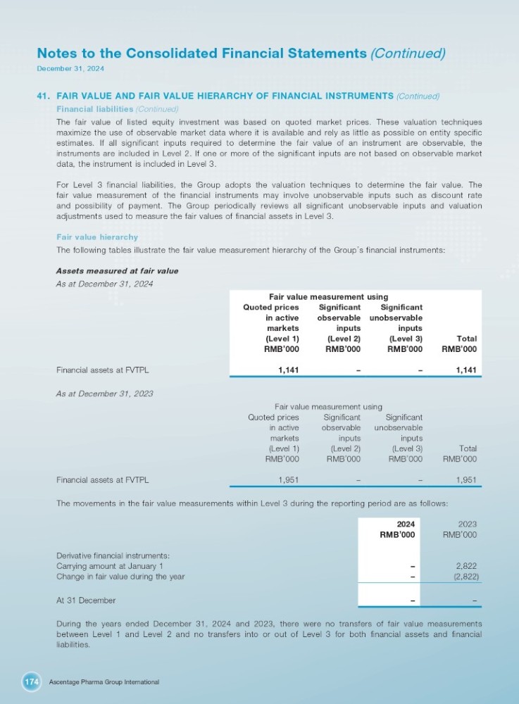 Ascentage Pharma Group International 174 Notes to the Consolidated Financial Statements (Continued) December 31, 2024 41. FAIR VALUE AND FAIR VALUE HIERARCHY OF FINANCIAL INSTRUMENTS (Continued) Financial liabilities (Continued) The fair value of listed equity investment was based on quoted market prices . These valuation techniques maximize the use of observable market data where it is available and rely as little as possible on entity specific estimates . If all significant inputs required to determine the fair value of an instrument are observable, the instruments are included in Level 2 . If one or more of the significant inputs are not based on observable market data, the instrument is included in Level 3 . For Level 3 financial liabilities, the Group adopts the valuation techniques to determine the fair value . The fair value measurement of the financial instruments may involve unobservable inputs such as discount rate and possibility of payment . The Group periodically reviews all significant unobservable inputs and valuation adjustments used to measure the fair values of financial assets in Level 3 . Fair value hierarchy The following tables illustrate the fair value measurement hierarchy of the Group ’ s financial instruments : Assets measured at fair value As at December 31, 2024 Fair value measurement using Significant Significant Quoted prices unobservable observable in active inputs inputs markets Total RMB ’ 000 (Level 3) RMB ’ 000 (Level 2) RMB ’ 000 (Level 1) RMB ’ 000 1,141 – – 1,141 Financial assets at FVTPL As at December 31, 2023 Fair value measurement using Significant Significant Quoted prices unobservable observable in active inputs inputs markets Total (Level 3) (Level 2) (Level 1) RMB ’ 000 RMB ’ 000 RMB ’ 000 RMB ’ 000 1,951 – – Financial assets at FVTPL 1,951 The movements in the fair value measurements within Level 3 during the reporting period are as follows: 2023 2024 RMB ’ 000 RMB ’ 000 2,822 – (2,822) – – – Derivative financial instruments: Carrying amount at January 1 Change in fair value during the year At 31 December During the years ended December 31 , 2024 and 2023 , there were no transfers of fair value measurements between Level 1 and Level 2 and no transfers into or out of Level 3 for both financial assets and financial liabilities .
